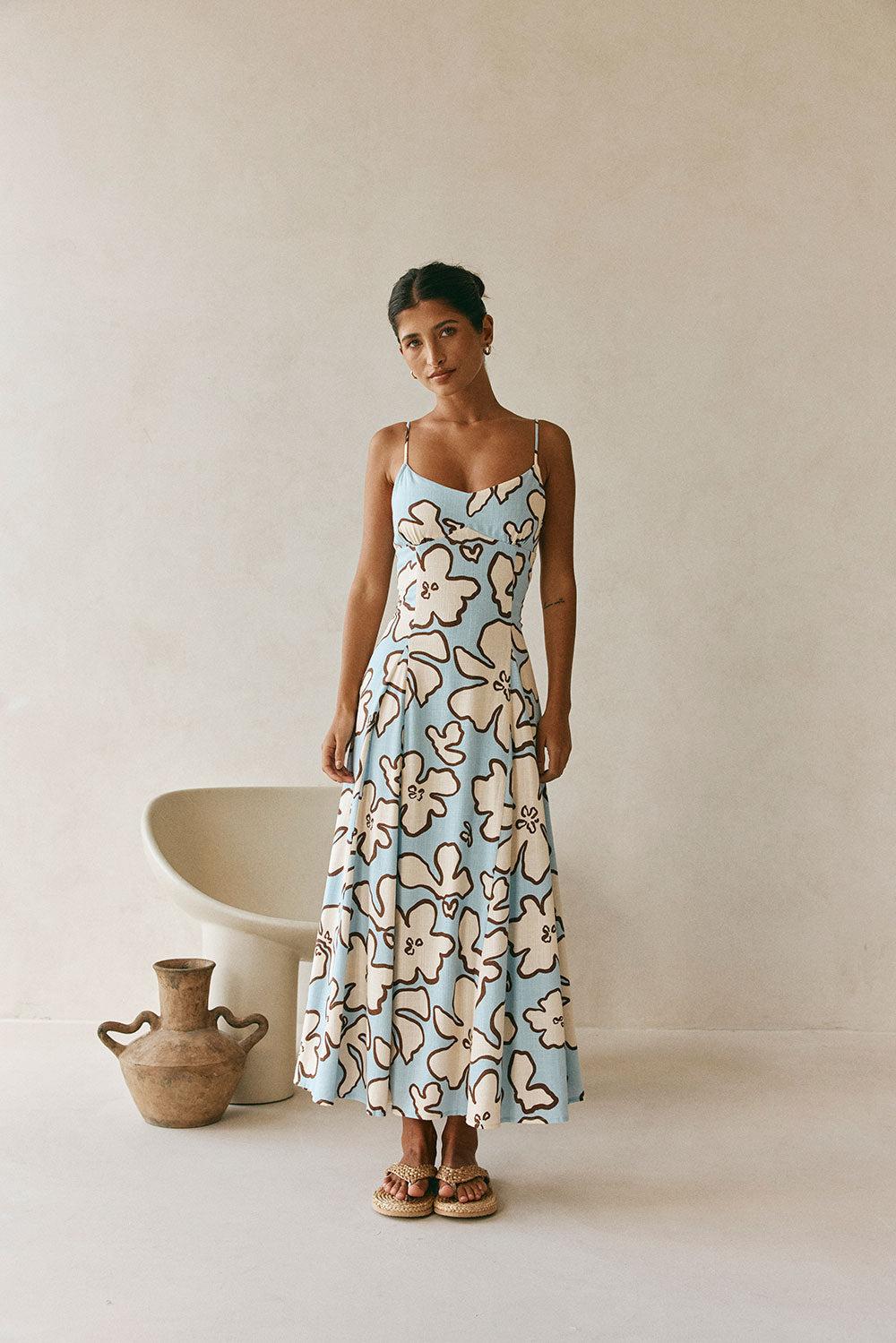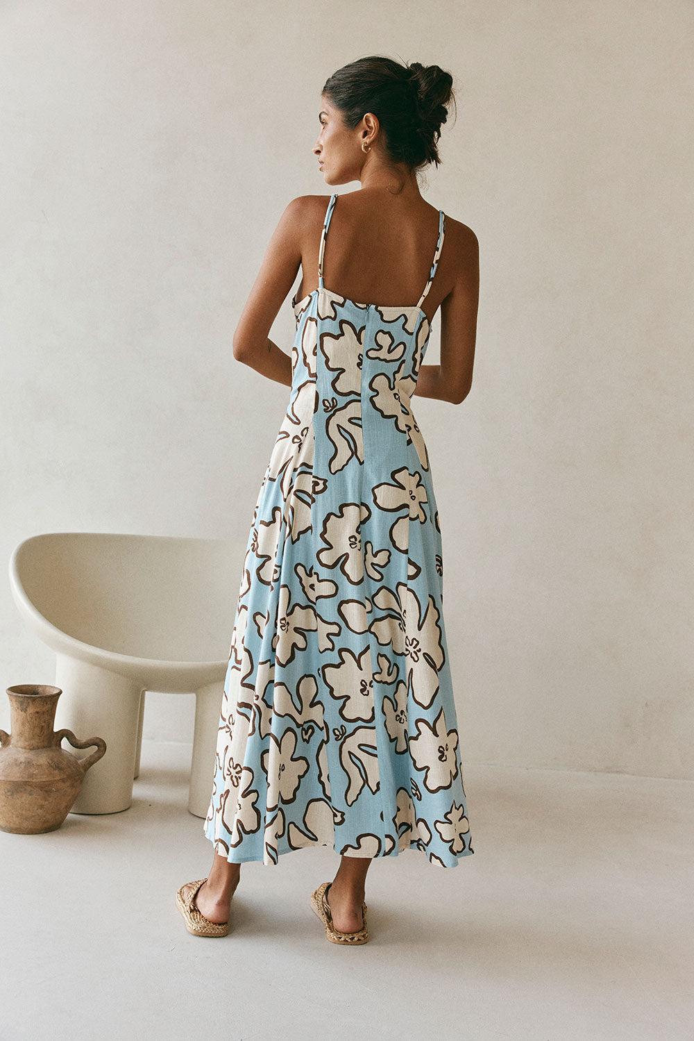 Introducing our exclusive new Outline Floral print! The Seme Dress features thin adjustable straps, curved under bust seam, covered button details down centre front, fitted bodice and a flouncy maxi with godets. Designed exclusively by Sabo.