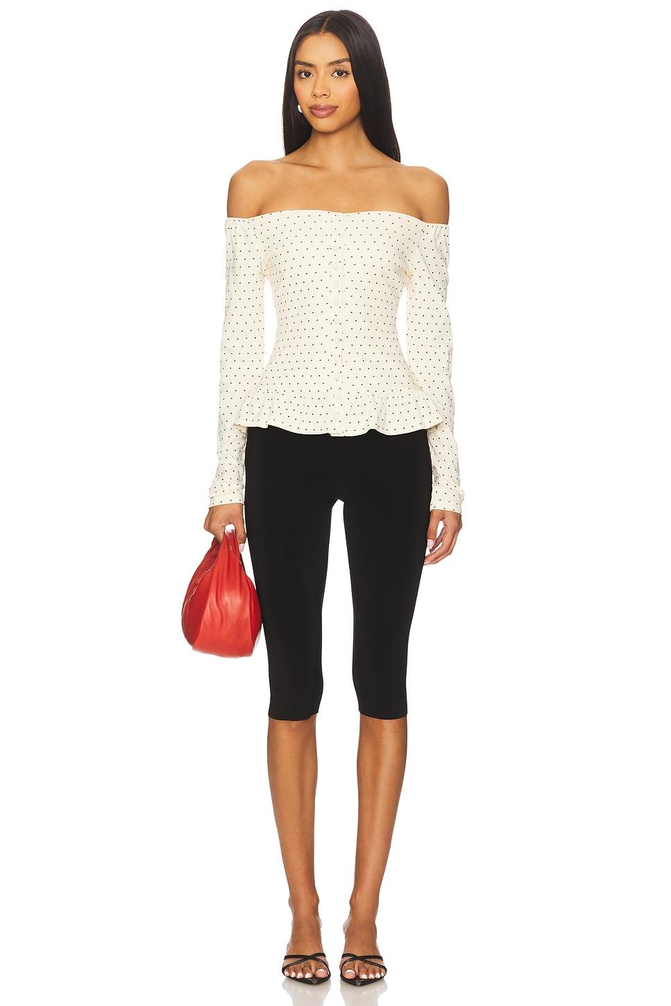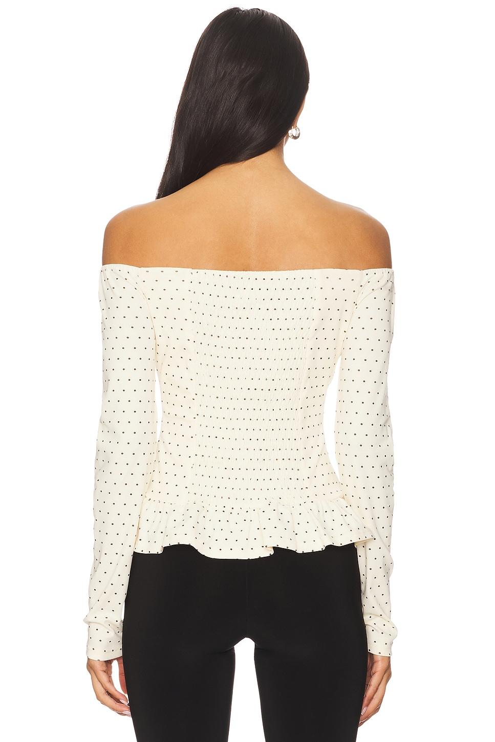 95% cotton, 5% spandex. Hand wash cold. Front button closure with off shoulder styling. Smocked back panel. Made in China. Revolve Style No. ATEJ-WS13. Manufacturer Style No. SERENE LONG SLEEVE.