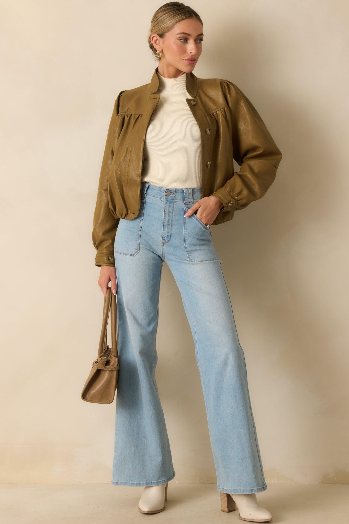 A nod to vintage silhouettes with a modern twist, the Set the Standard Olive Brown Faux Leather Jacket captures that effortlessly cool, borrowed-from-the-past charm. Its glossy finish, structured shoulders, and cinched shape make it a standout layer for everything from classic denim to tailored trousers. This olive brown faux leather jacket features puffed shoulders, a structured collar, and button-front closure with long sleeves and buttoned cuffs for a softly tailored, retro-inspired finish. 55% Polyurethane & 46% Viscose Lined: 100% Polyester Hand Wash Cold Manufactured in China Designed in The USA Model is Wearing a Size Small