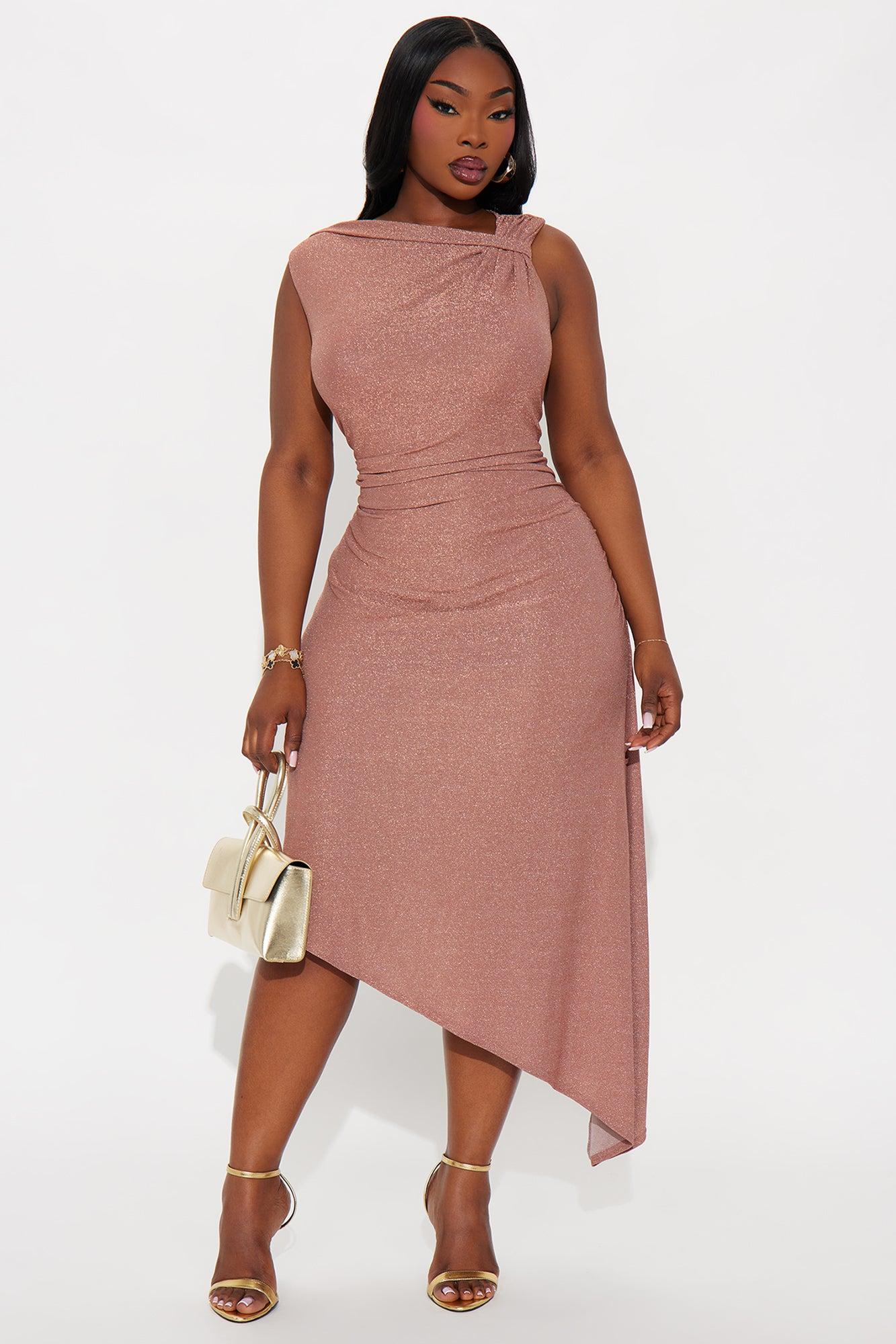 Available In Gold And Rose. Metallic Midi Dress High Neck Sleeveless Knot Detail Ruched Asymmetrical Hem Stretch Length Measured Flat = 40" Self: 70% Nylon 25% Polyester 5% Spandex Lining: 100% Polyester Imported California Proposition 65WARNING: Cancer and Reproductive Harm - www.P65Warnings.ca.gov.