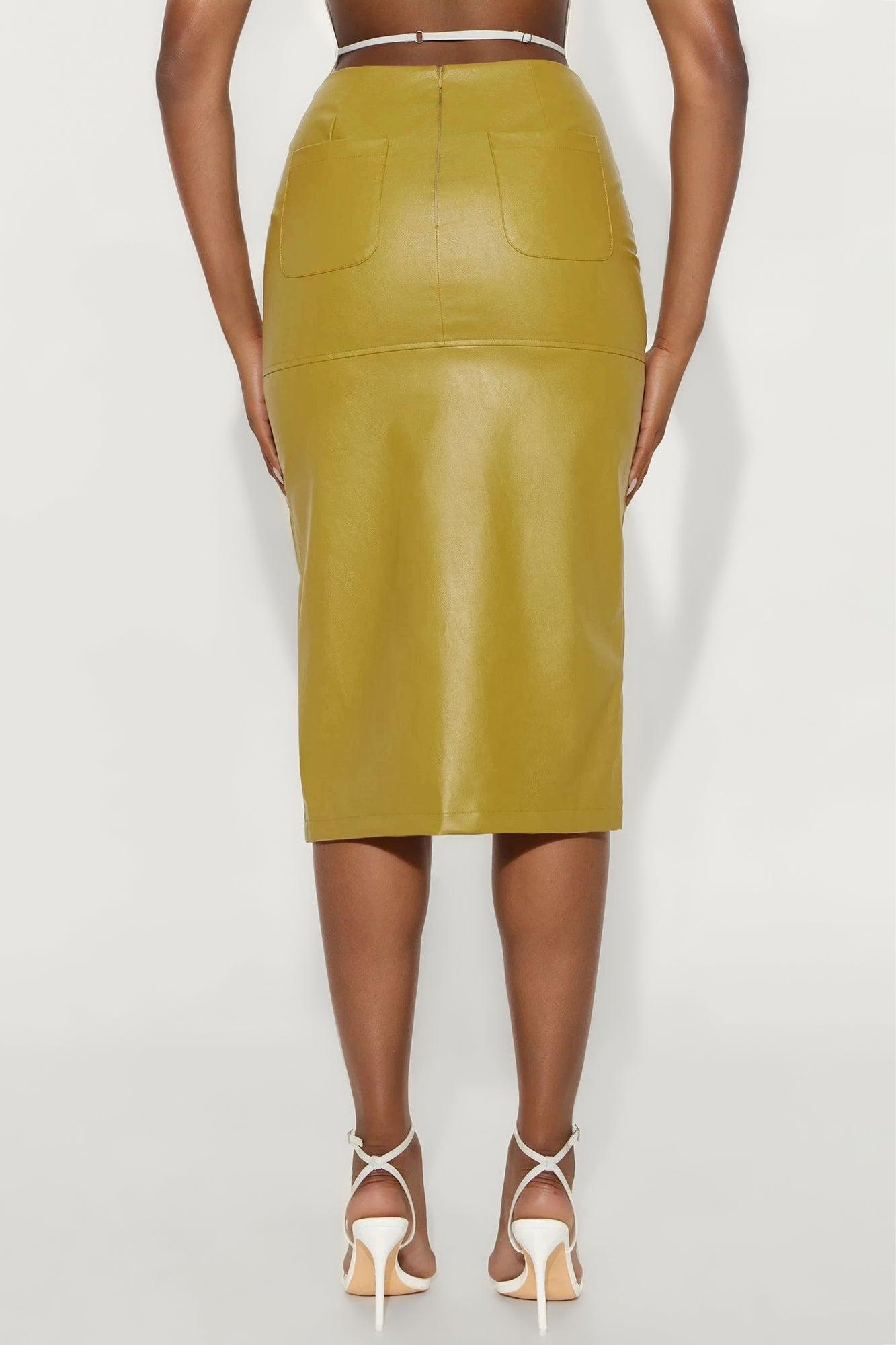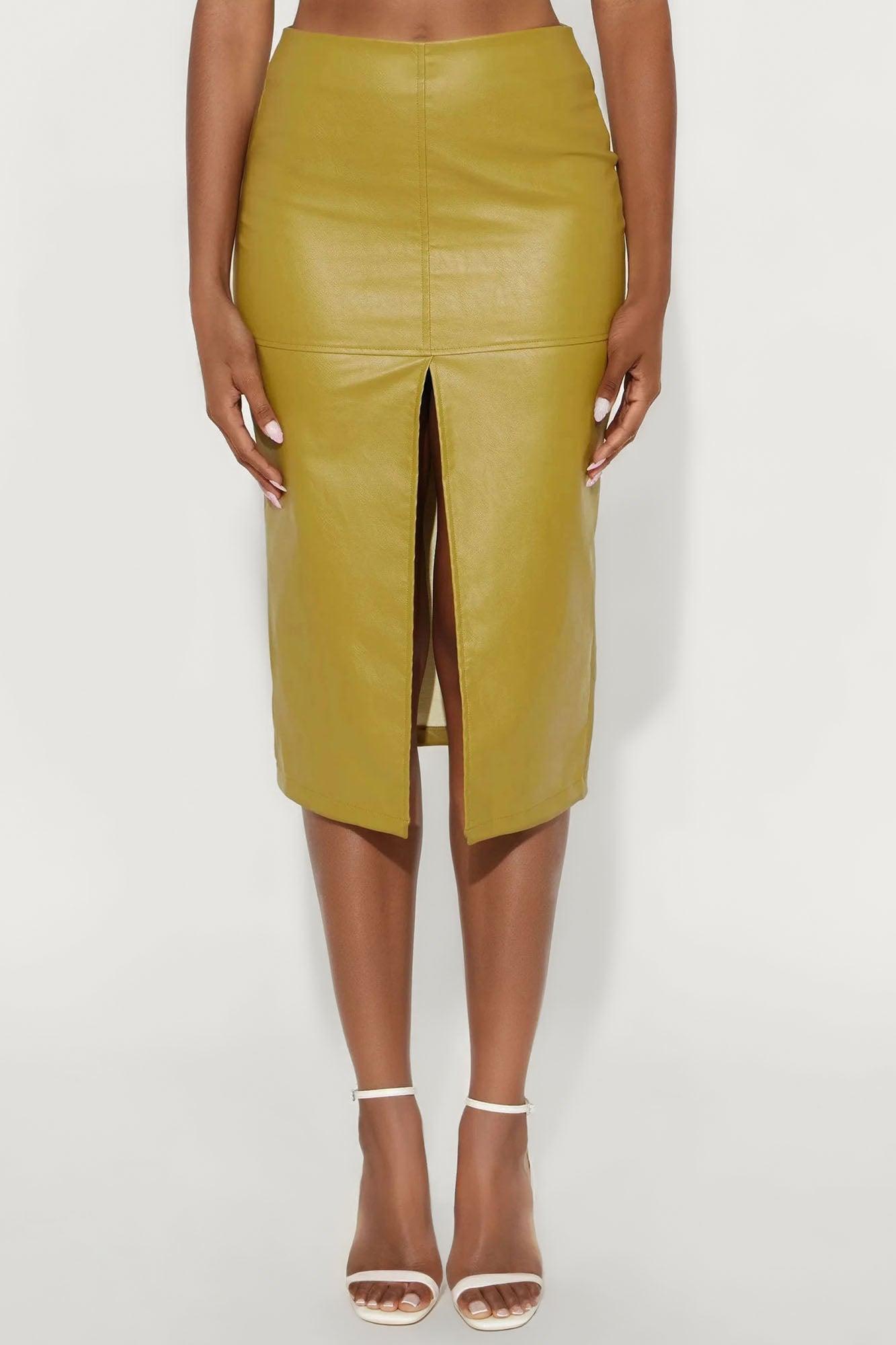 Available In Chartreuse And Dark Brown. Midi Skirt Zipper Closure High Rise Back Pockets Front Slit Detail Faux Leather Stretch 30" Length 100% Polyester Imported
