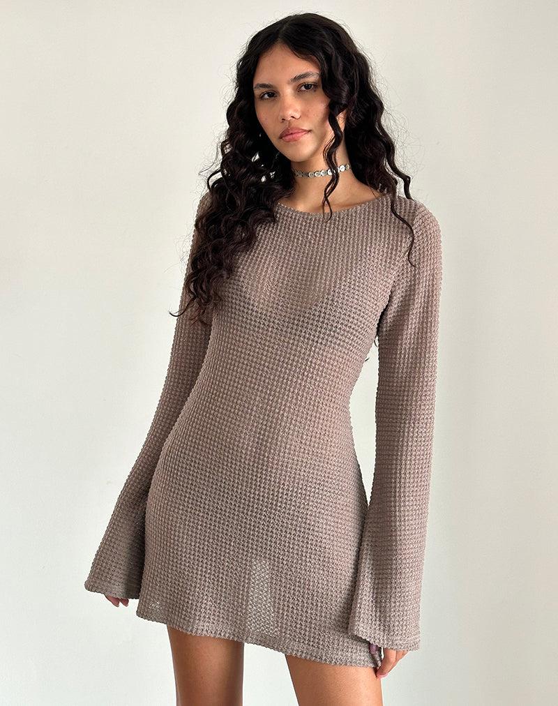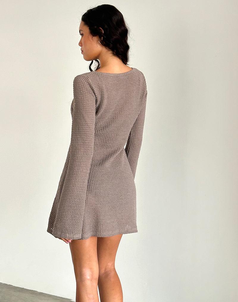 The Yelena Dress in waffle light taupe knit boasts long fluted sleeves, an A-line skirt, and a wide boat neckline, offering a stylish and comfortable option for any occasion. MODEL WEARS SIZE:EXTRA SMALL - MODEL HEIGHT:5'7