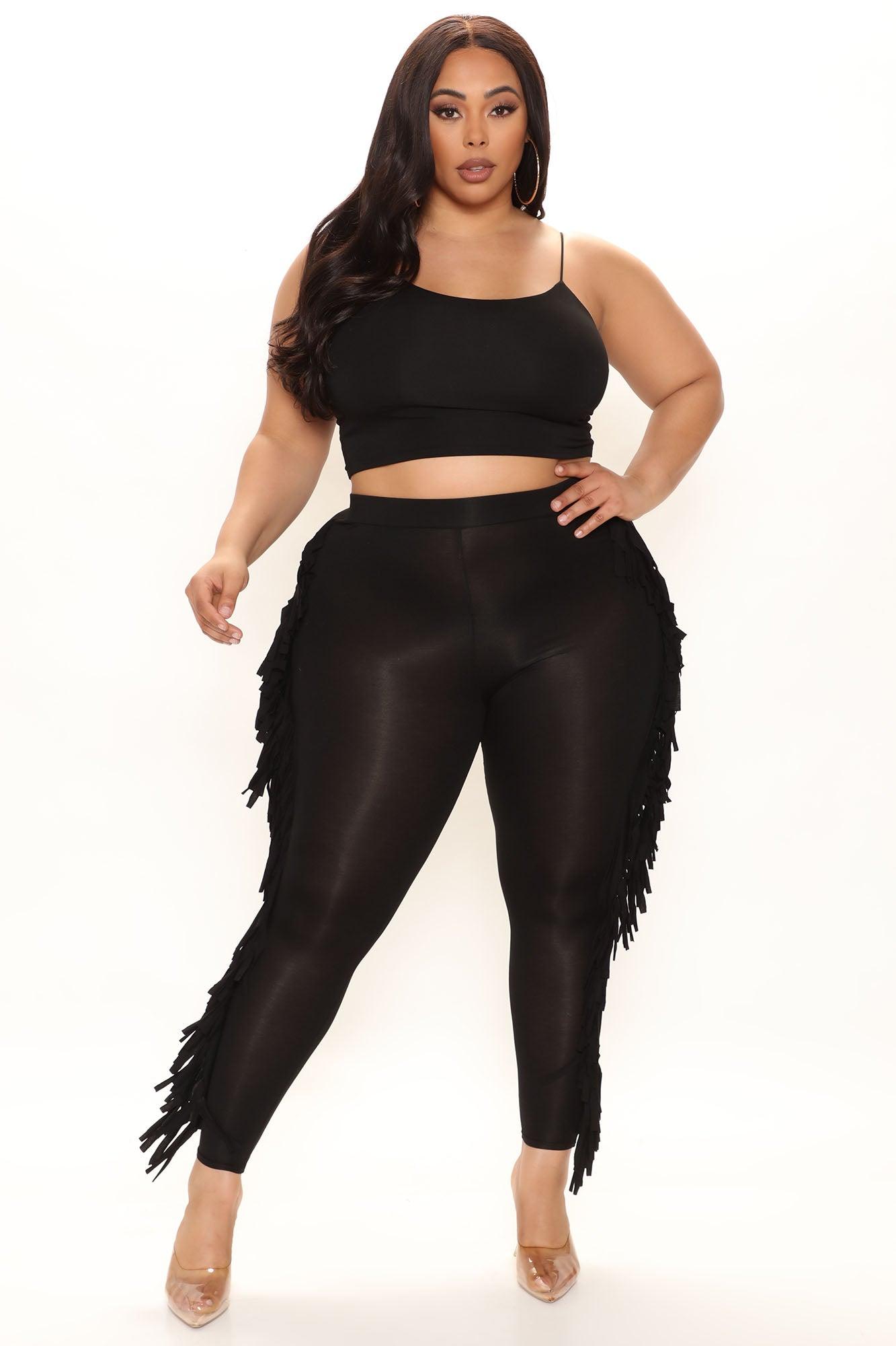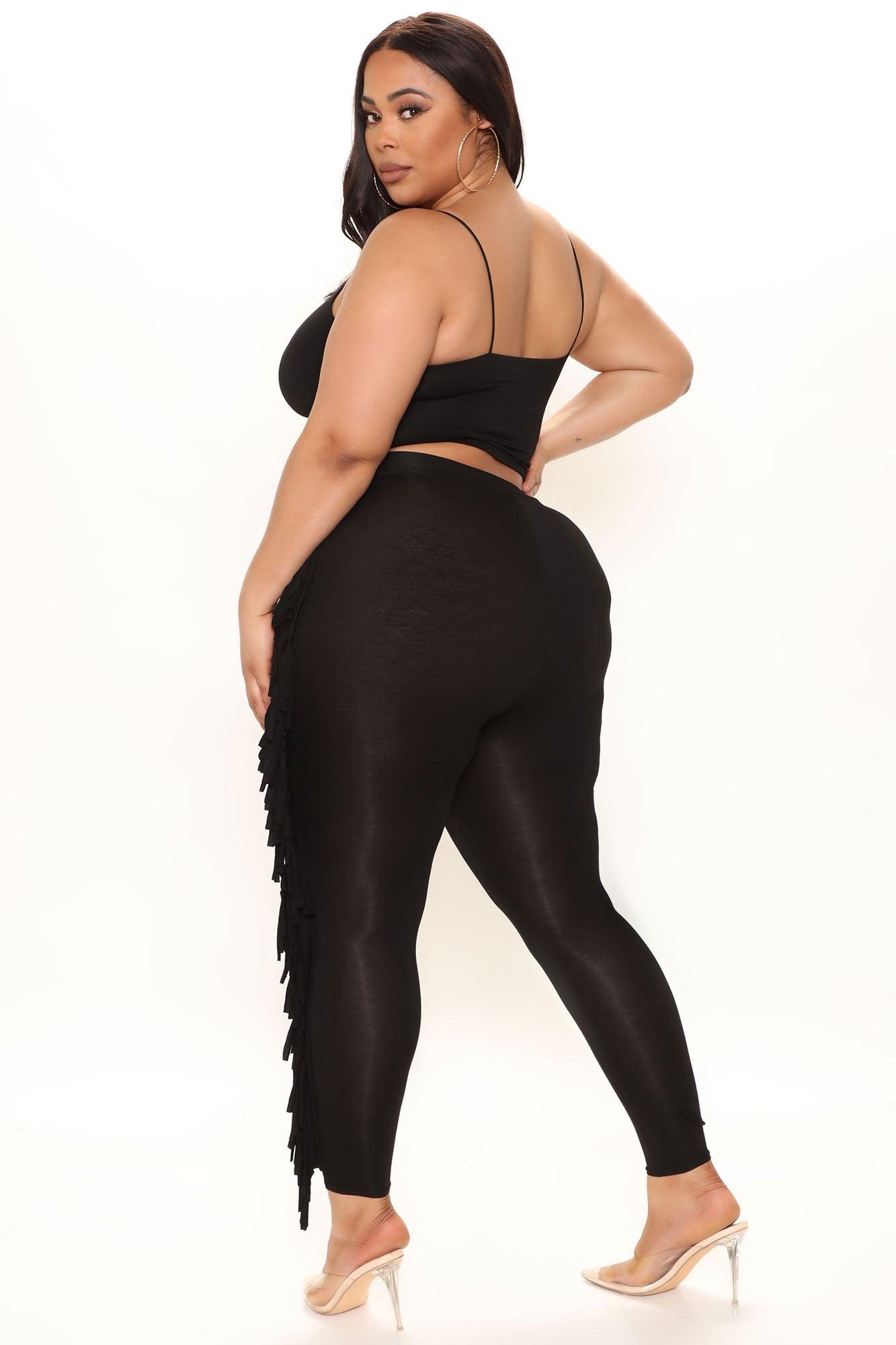 Available In Black And Chocolate. High Rise Legging Fringe Available in Black and Chocolate Skinny Leg Stretch 28" Inseam Self :95% Rayon 5% Spandex Imported California Proposition 65 WARNING: Cancer and Reproductive Harm - www.P65Warnings.ca.gov.