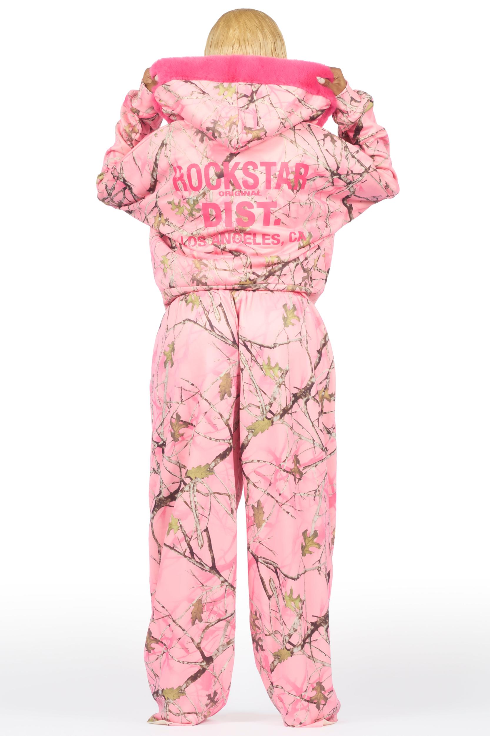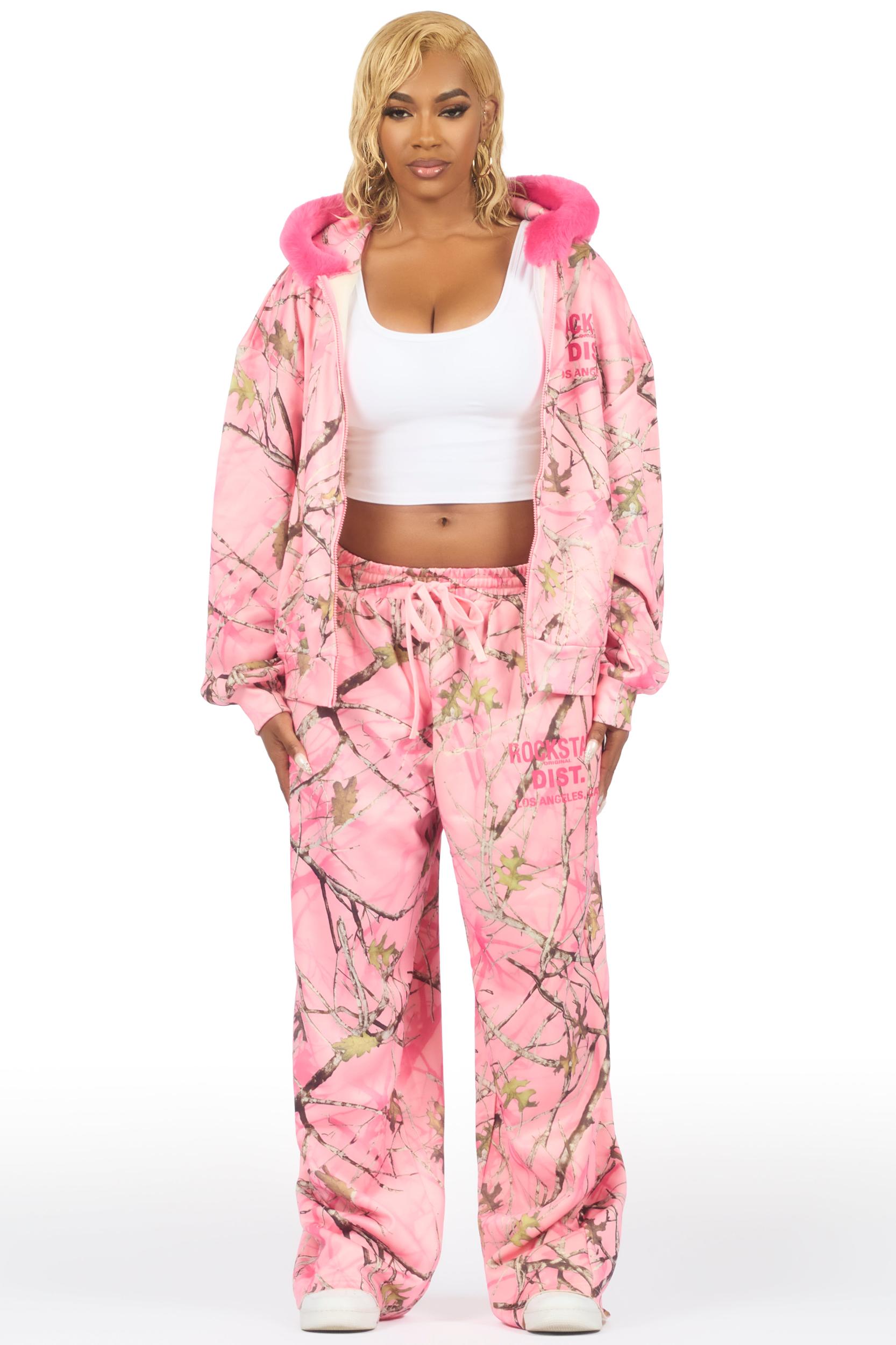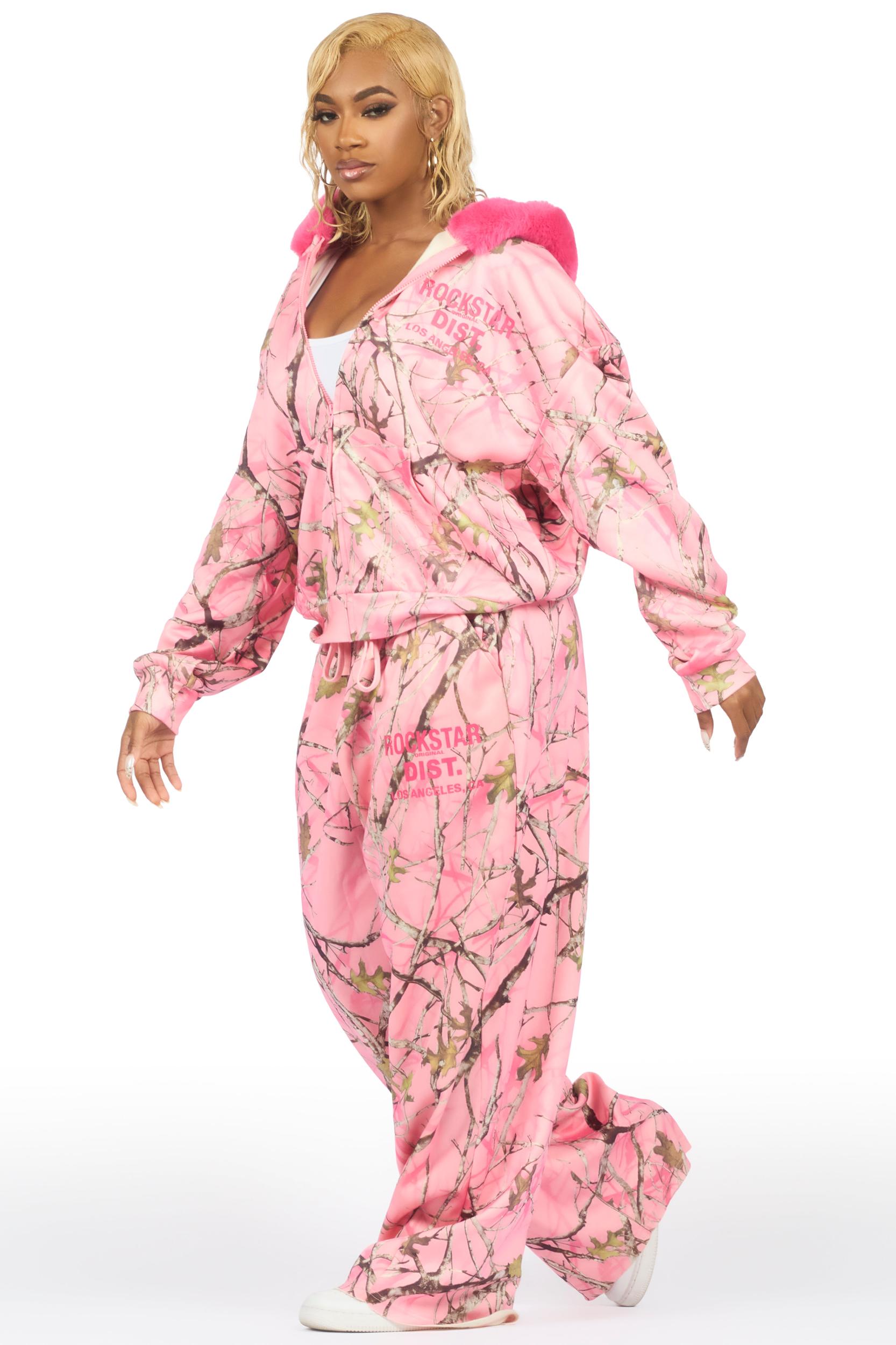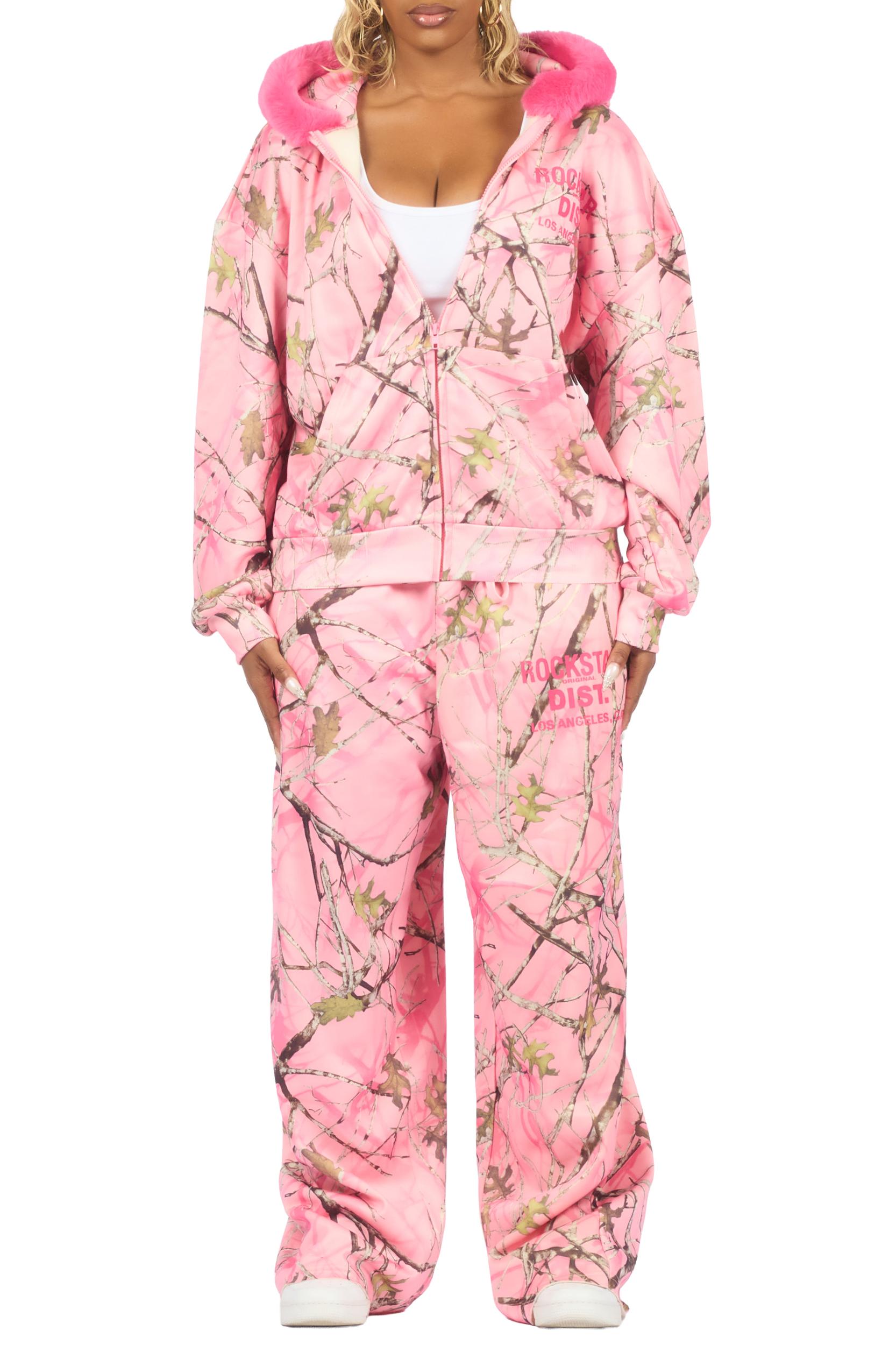 An urban two-piece hoodie and baggy pant set for women. Designed with organic cotton and custom detailing for a must-cop basic streetwear essential. Faux fur trim hood Full front zip closure Dual slant pocket Ribbed knit trims Drawstring waistband Oversized-fit Slant pockets Baggy-fit Camouflage Custom printed RSO logos
