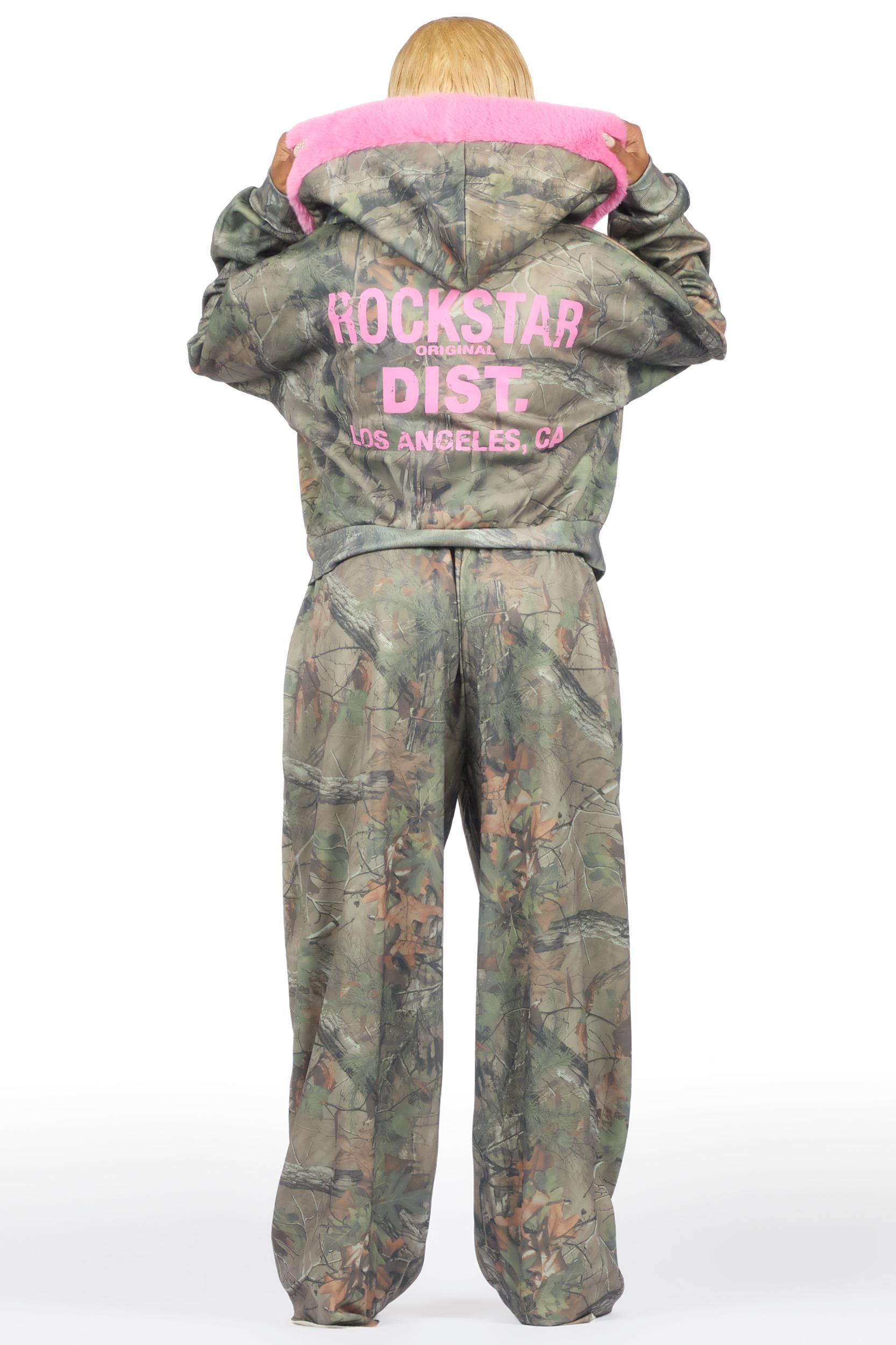 An urban two-piece hoodie and baggy pant set for women. Designed with organic cotton and custom detailing for a must-cop basic streetwear essential. Faux fur trim hood Full front zip closure Dual slant pocket Ribbed knit trims Drawstring waistband Oversized-fit Slant pockets Baggy-fit Camouflage Custom printed RSO logos