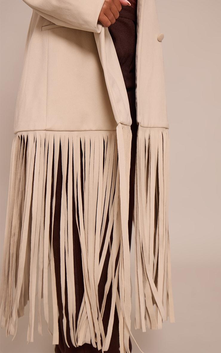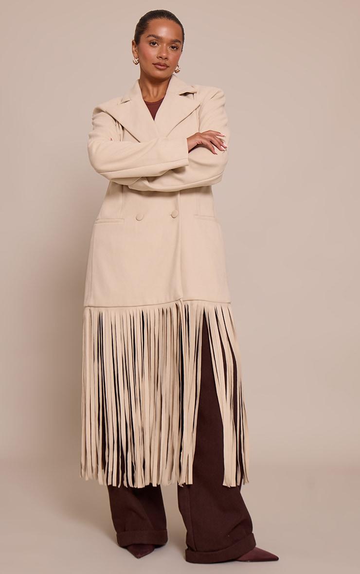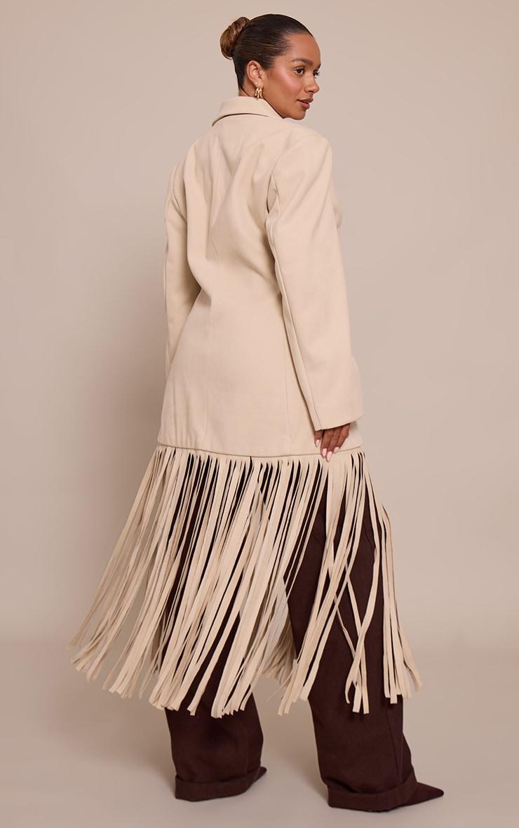 Designed with hourglass figures in mind these curve enhancing tweaks do the most (for both your figure and confidence). PLT Shape looks good on you. Command attention with the shape cream wool look cinched waist fringe hem blazer, an outerwear piece that redefines daywear. Its longline silhouette begins with a relaxed shoulder, expertly tapering to an adjustable cinched waist that sculpts your frame, before flowing into a show-stopping fringe hem. Featuring sharp notched lapels, this blazer is designed for impact. Pair it with tailored wide-leg pants and a simple knit for a polished edge, complemented by sophisticated high heels and essential gold hoops to own the room.Length approx 134.5cm/53inch (Based on sample size US 4)Model wears size UK 8/ EU 36/ AUS 8/ US 4Model Height - 5ft 7inchp]:!mb-4inch>Brand: PrettyLittleThingCategory: OuterwearProduct type: Fitted BlazerColor: CreamMaterial: Faux WoolOccasion: Day