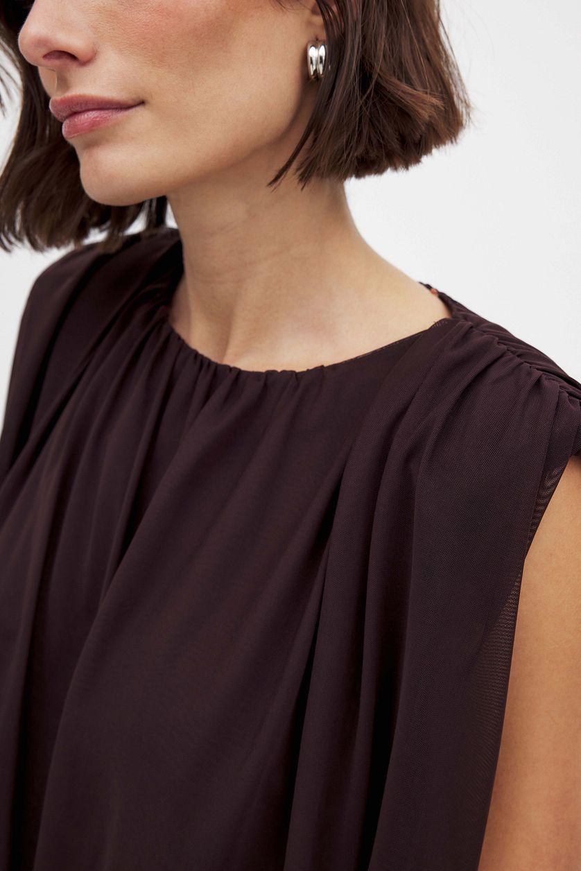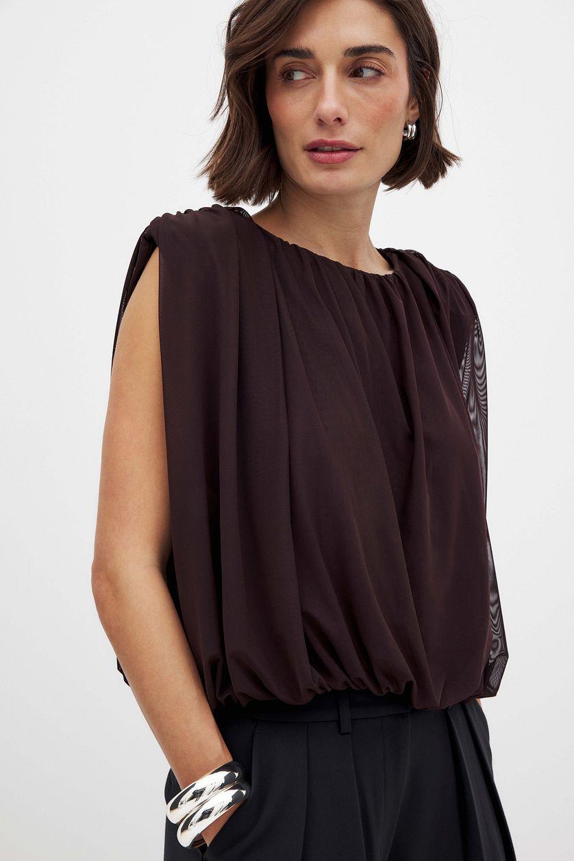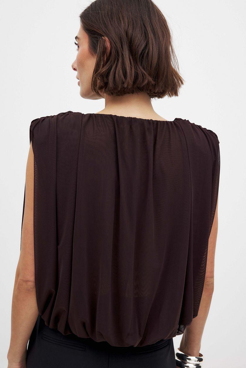 This top features a loose fit and a stretchy mesh layer on the outside with an inner lining. It has gathering at the shoulders and at the waist and a padded shoulder. Our top has a round neck and a sleeveless design.
