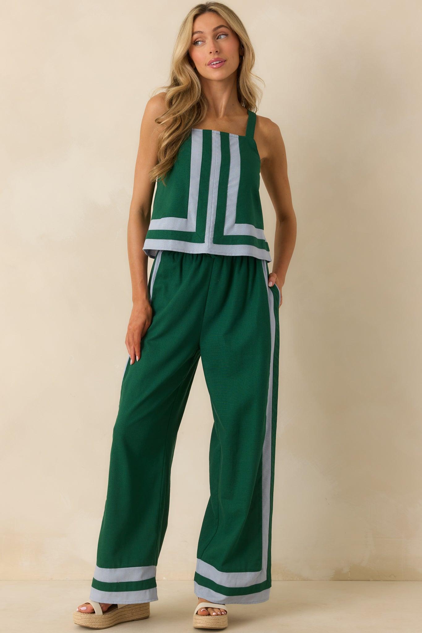 The She Always Knows Green Contrast Trim Linen Blend Wide Leg Pants are a laid-back take on everyday confidence. Relaxed but styled, they’re perfect for when you want to keep things cool and collected without trying too hard. These green pants feature a light blue contrast trim throughout, a high rise, elastic waistband, adjustable self-tie drawstring, wide leg design, and functional pockets. 40% Linen, 40% Viscose, 10% Cotton & 10% Polyester Lined: 100% Rayon Hand Wash Cold Manufactured in China Designed in The USA Model is 5'8" and is Wearing a Size Small