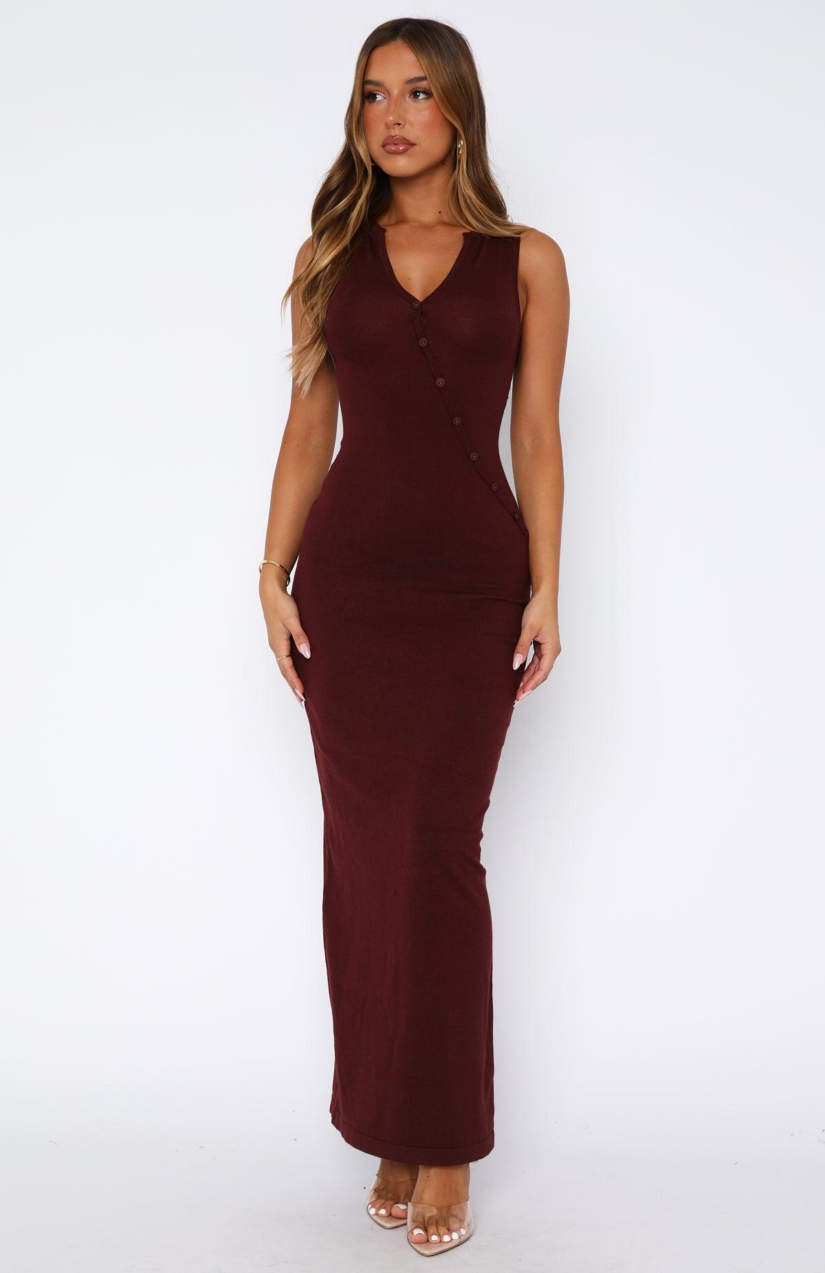 Crush update: The She's Back Maxi Dress Burgundy! Featuring thick shoulder straps, front asymmetrical button up closure, maxi length, unlined, stretch, knit material for an easy slip on design. We are obsessed! 72% Viscose 28% Nylon Em is 170cm & is wearing an XS Ash is 166cm & is wearing an XS