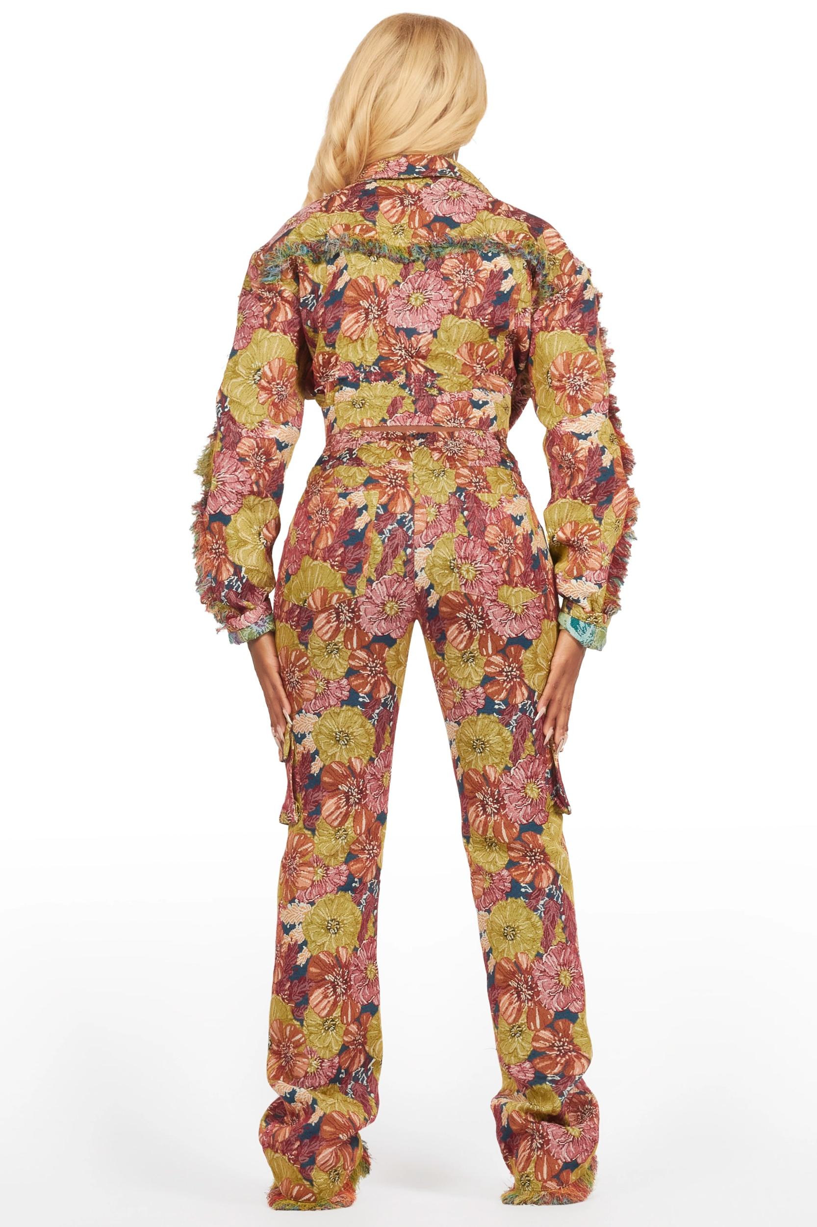 An urban tapestry denim jacket for women in navy. Designed with contrast botanical fabric and custom embroidery for the perfect layering piece. Collared neckline Full front button closure Dual button chest pockets Tapestry fabric Cropped length Frayed seams