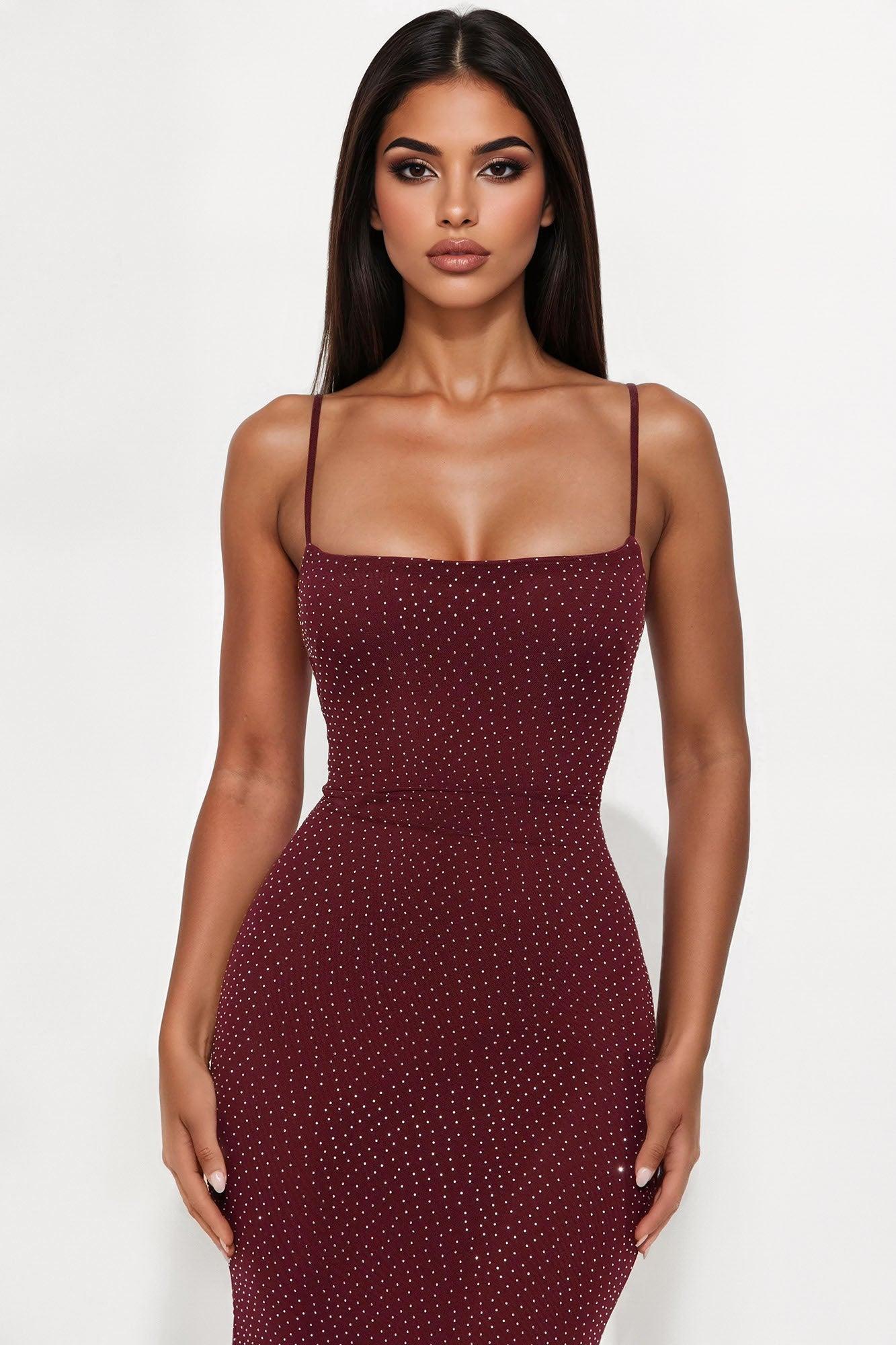 Available In Wine. Rhinestone Mesh Maxi Dress Spaghetti Strap Scoop Neckline Lined Stretch Self: 95% Nylon 5% Spandex Lining: 95% Polyester 5% Spandex Imported California Proposition 65WARNING: Cancer and Reproductive Harm - www.P65Warnings.ca.gov.