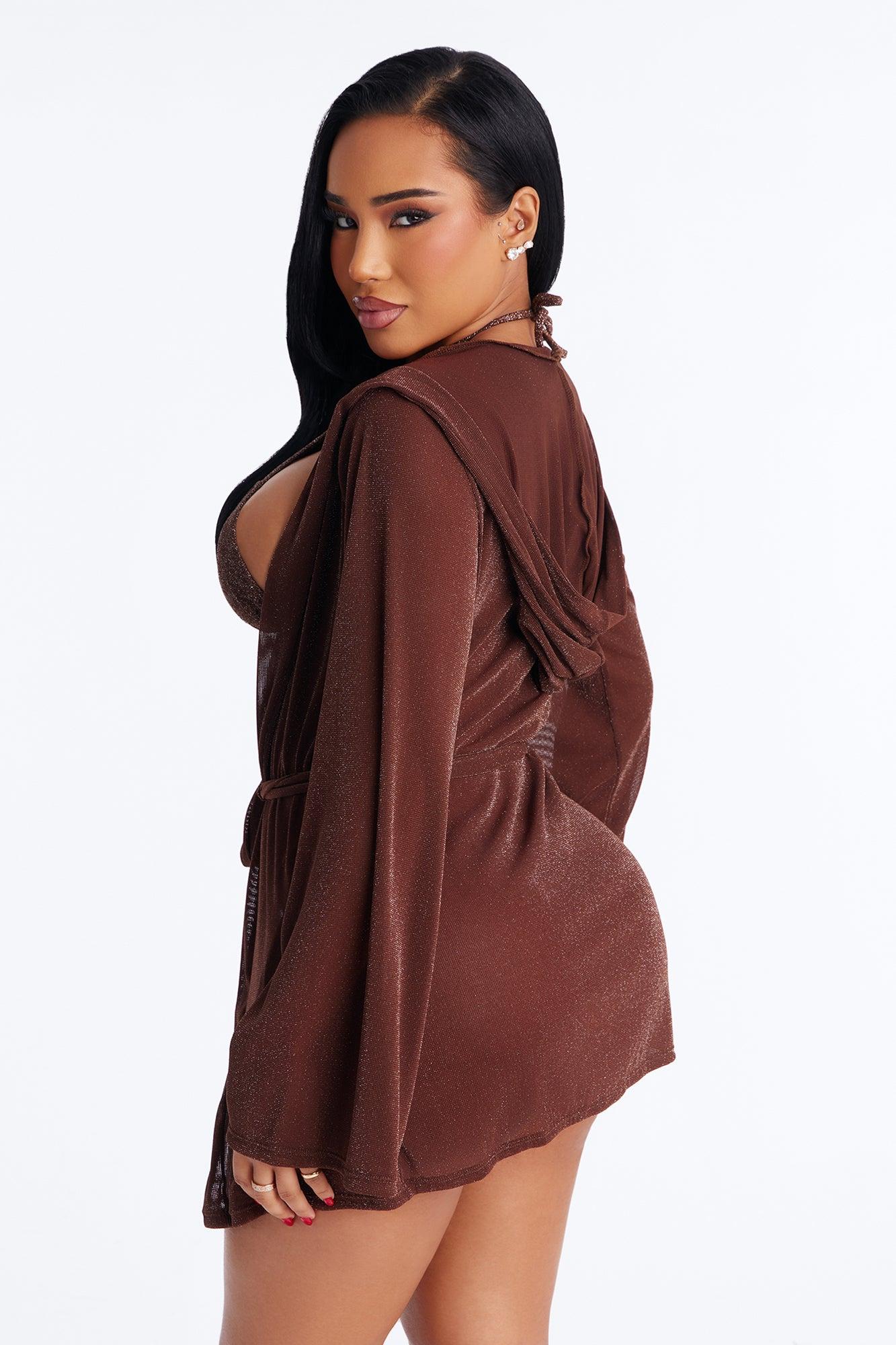 Available In Fuchsia And Tan. 2 Piece Bikini Robe Coverup Long Sleeve Hooded Final Sale Bra & Bottom Shell: 57% Polyester 33% Metallic Yarn 10% Spandex Bra & Bottom Lining: 95% Polyester 5% Spandex Coverup Self: 70% Nylon 30% Metallic Yarn. Imported California Proposition 65WARNING: Cancer and Reproductive Harm - www.P65Warnings.ca.gov.