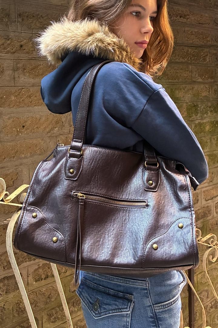 Faux leather bag PU, tote model, fully lined with pockets, external pocket, zip fastening, with handles. Height x Length x Width: 25 x 35 x 15 cm.