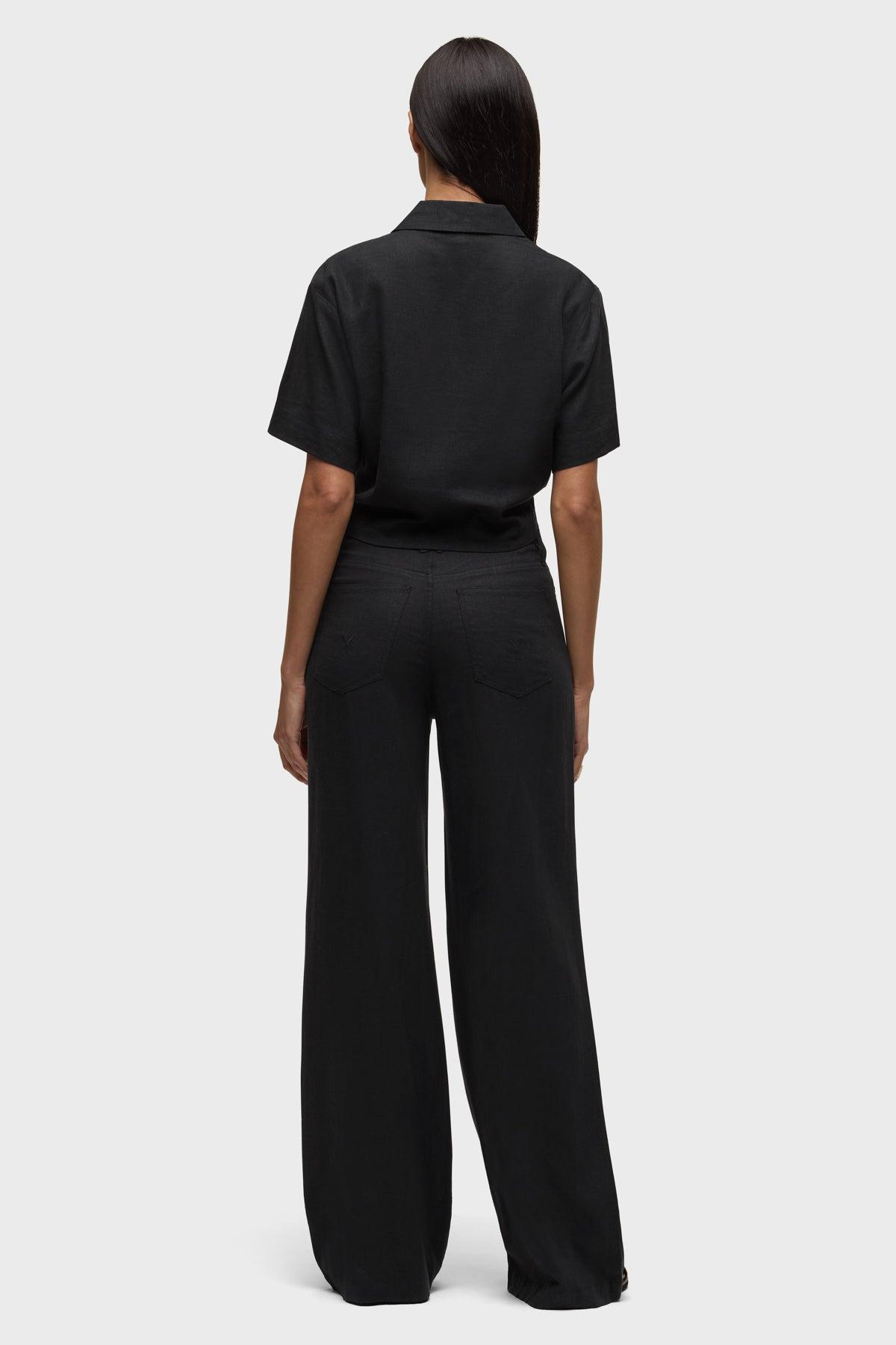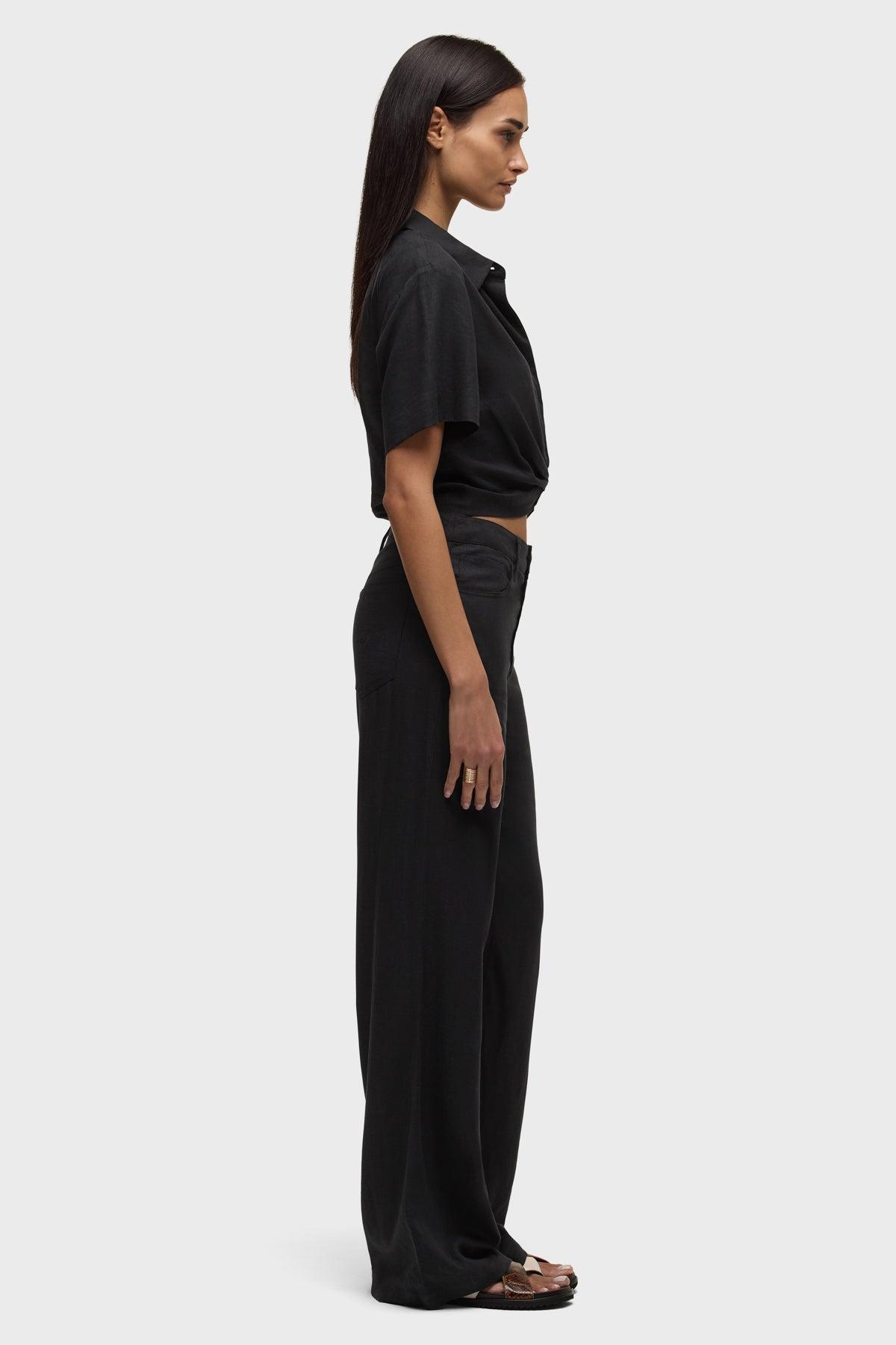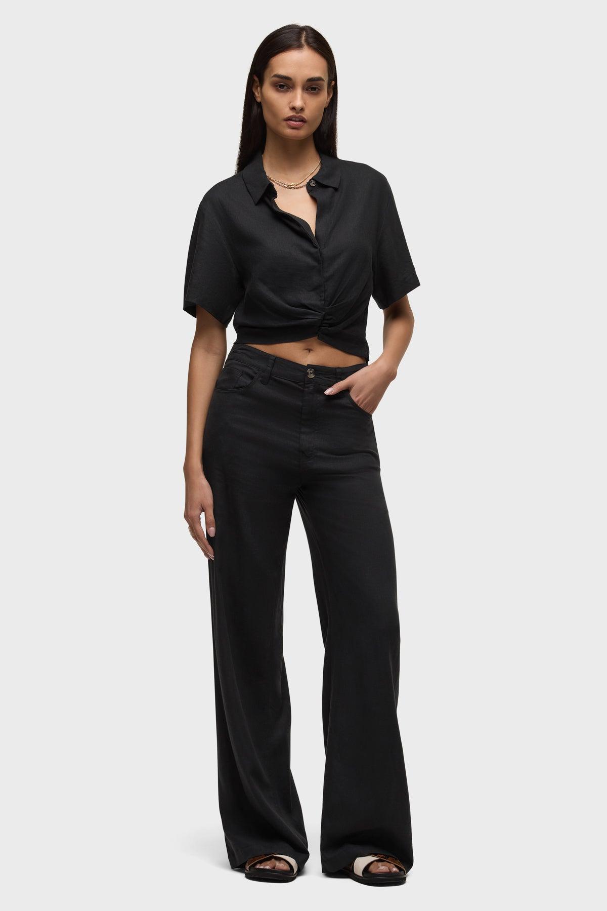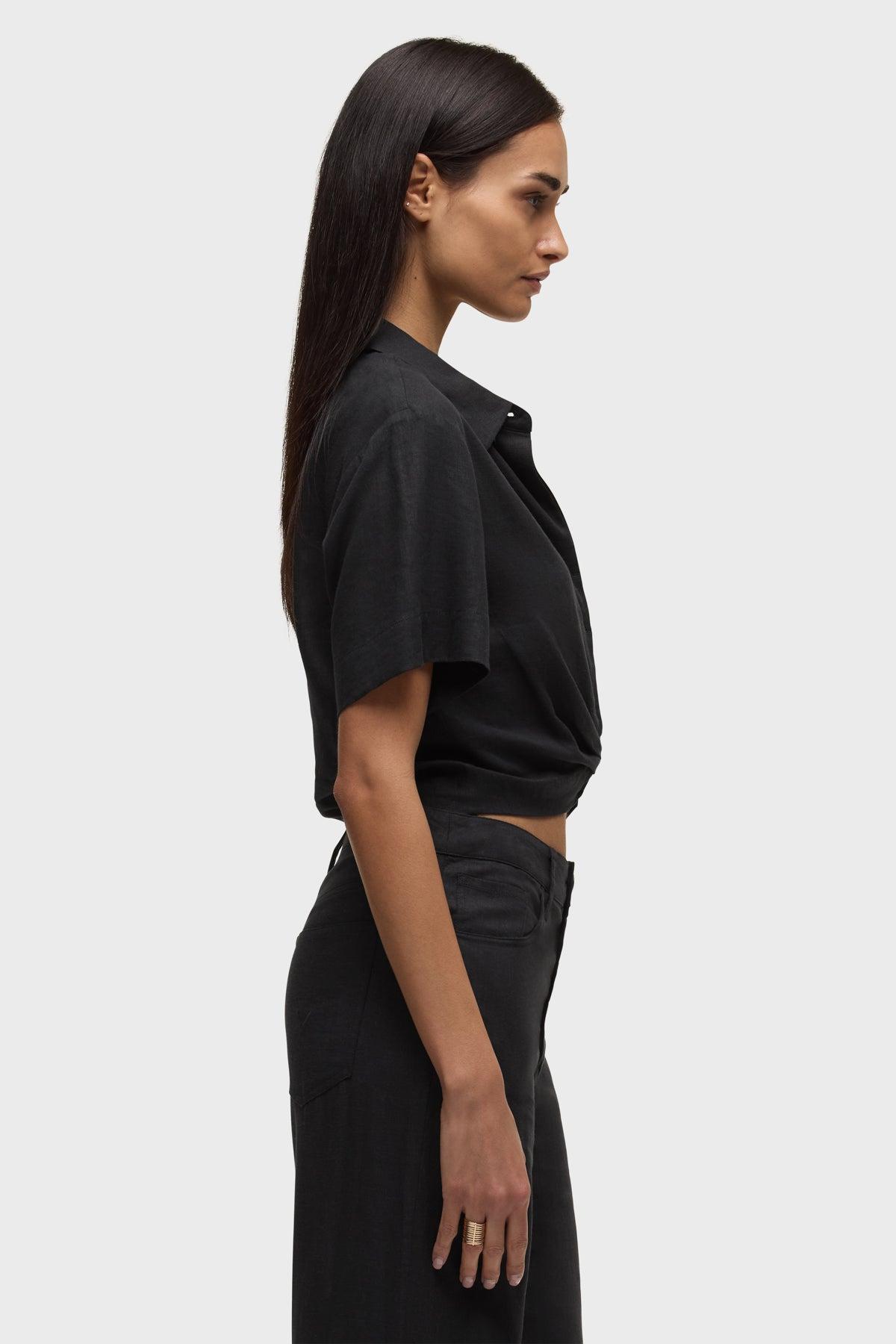 Description The Short Sleeve Knotted Button Down Shirt in Black is a waist-cinching top with a cool, flattering fit. It is made of black linen fabric and features a knotted detail at the front, a side zipper for easy entry and sewn-on buttons with a hidden placket. Product Details Body Length: 18", Chest: 34.5", Sleeve Length: 8"Model Height 5'9"Model wearing size 25/SMeasurements based on size 27/S Fabric & Care Content: 55% Linen, 45% RayonMachine wash cold gentle cycleDo not bleachTumble dry lowMedium iron if needed