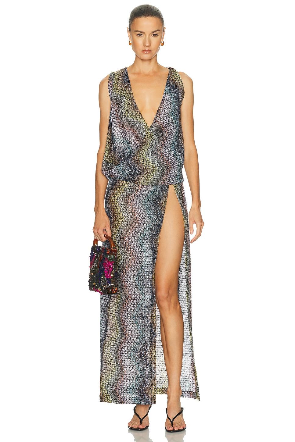 top66% viscose, 18% polyamide, 16% metallic fibers / Dry clean only / Pull-on styling / Front and back V-neck design / Ruched sides / Midweight metallic knit fabric / Item not sold as a set / Made in Italy / Our Style No. MSON-WS39 / Manufacturer Style No. DS26SK16 / Model is wearing size 36.