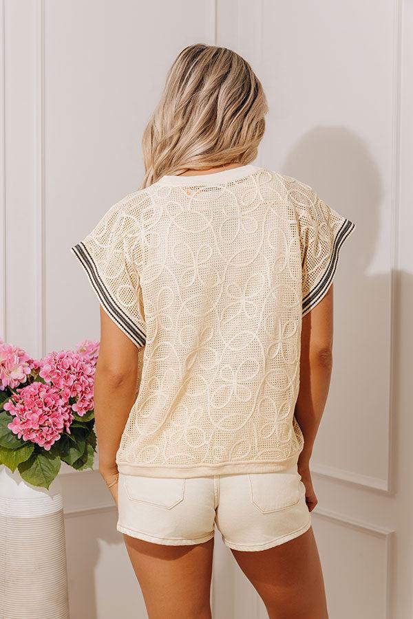 - She's cute, she's detailed, and she's doing the most! This trendy knit top features embroidered accents and a woven trim that brings a pop of chic energy.
