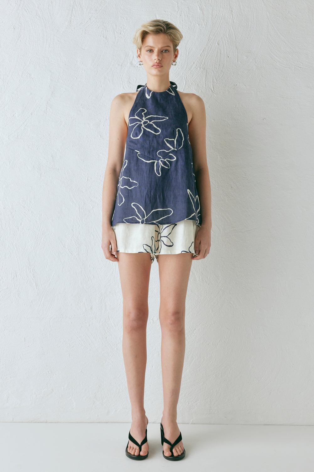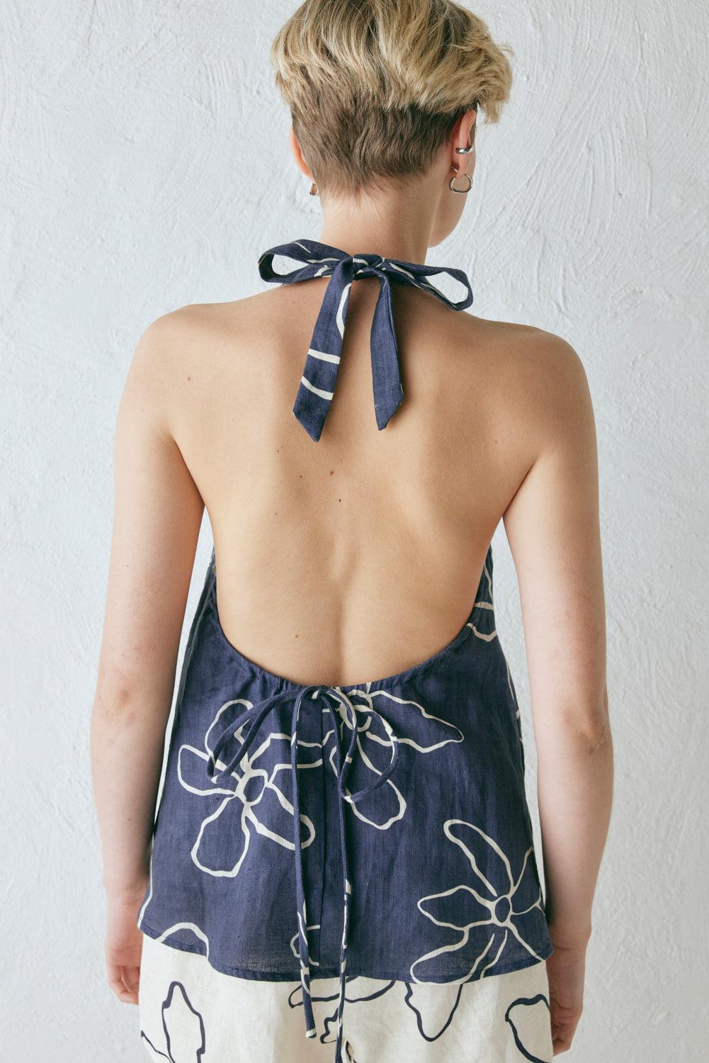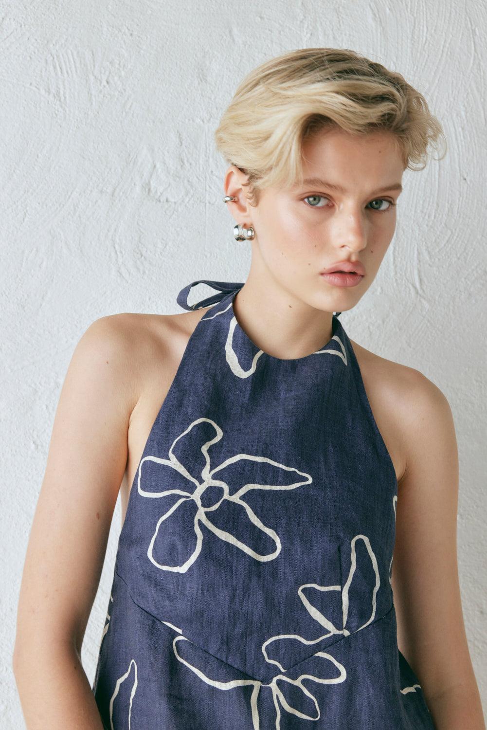 Exclusive in-house print. Main: 100% Linen. Bust lining: 100% Cotton. Tie up halter neck. Adjustable drawstring back. Low back. Cold Hand Wash / Cool Iron On Reverse. Designed in Australia.