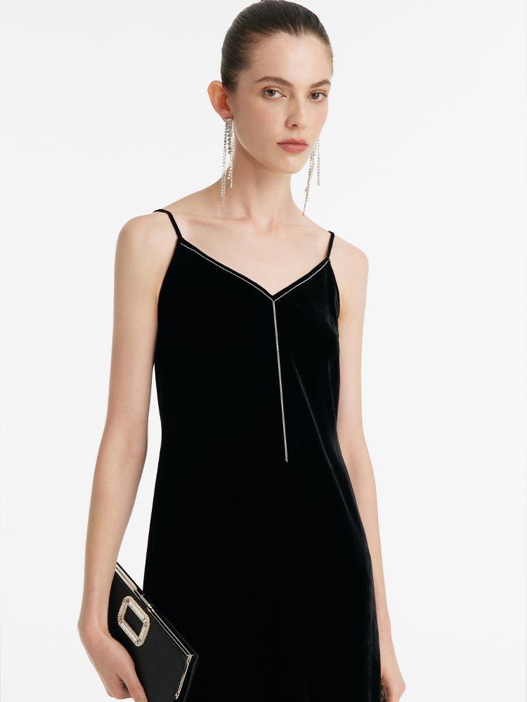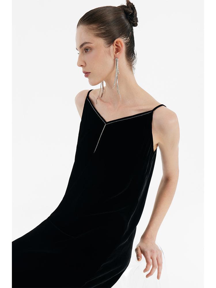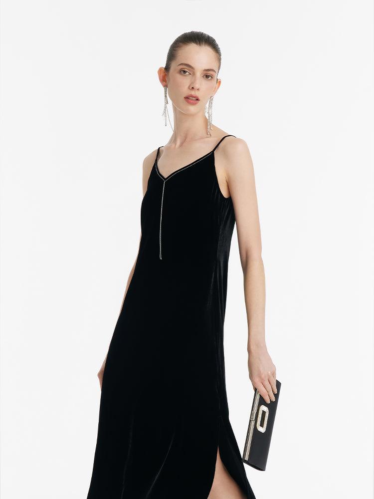 -V-neck -Soft and comfortable -Party wear The dress is crafted from a silk velvet blend, containing 13% mulberry silk, ensuring the fabric's high quality is palpable in its understated, soft sheen, and smooth, lightweight feel that gracefully drapes the body. The H-line fit allows for unencumbered movement, with a side