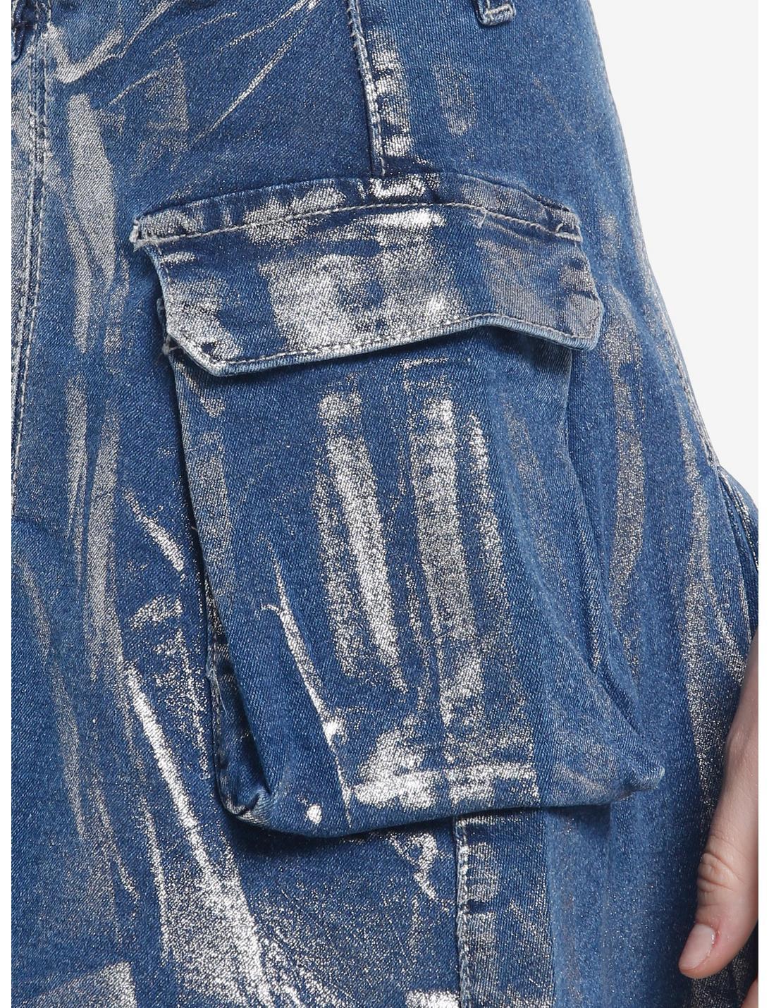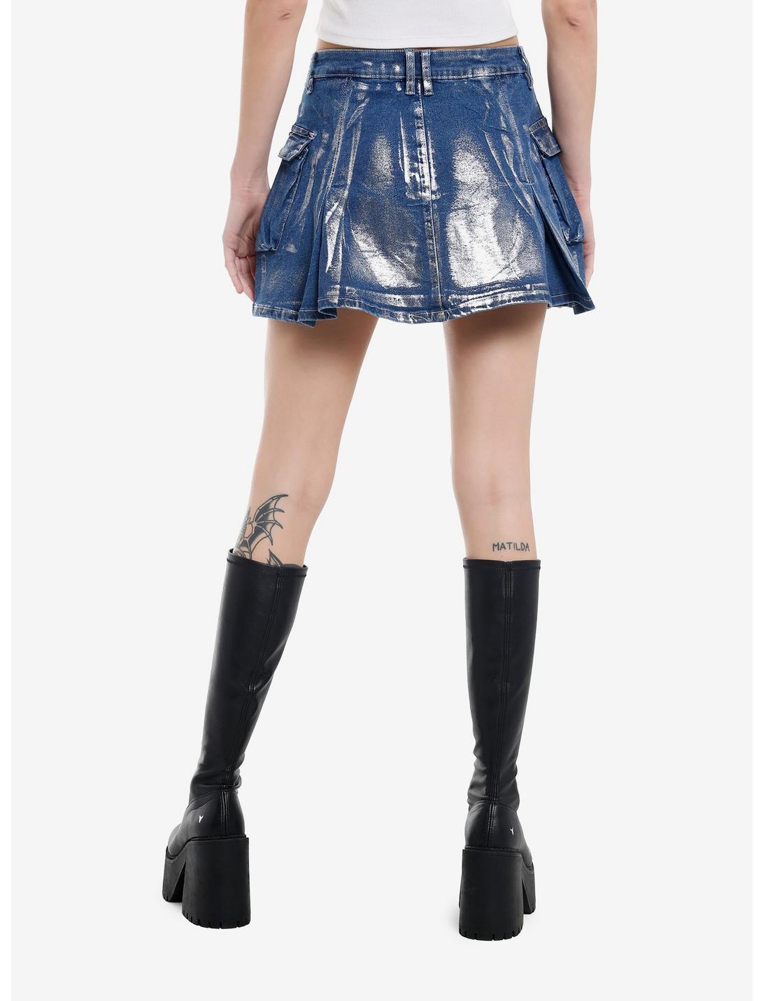 This denim mini skirt is anything but ordinary! It's a blue wash with silver coating shining over it, plus cargo pockets on each thigh.71% cotton; 24% polyester; 3% viscose; 2% spandexWash cold; dry flatLength: 14"ImportedListed in junior sizesModel is 5'10"Model wears size Medium