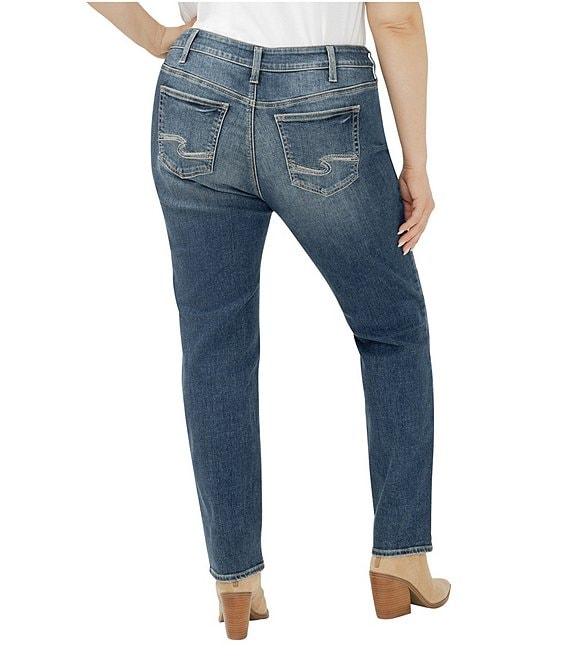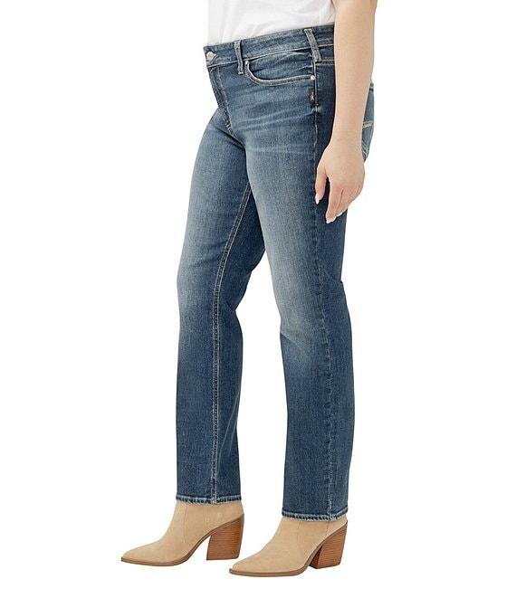 From Silver Jeans Co. Plus, these jeans feature: Stretch denim fabrication Medium indigo wash Mid rise Straight leg 5-pocket style Belt loops Button/zip fly Approx. 31" inseam, 11.5 mid rise, 17.62" back rise, 14.5" leg opening Cotton/polyester/elasterrel polyester/elastane Machine wash/tumble dry Imported. Meet Elyse, our most comfortable curvy fit jeans. These women's mid rise jeans are designed with a little extra room in the hip and thigh to perfectly hug your curves and feature an eased waistband to keep the midsection comfy, preventing digging even when sitting. Straight leg jeans in a medium indigo wash.