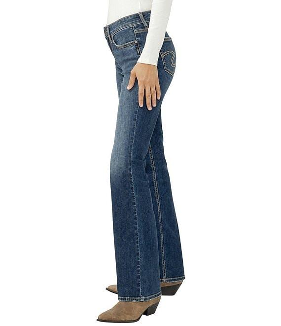 From Silver Jeans Co., these jeans feature: Mid rise Curvy fit Flattering silhouette with ease in the hips and thighs Contoured waistband ensures a zero-gap fit Zip/button front closure Belt loops 5-pocket styling 2 front pockets (1 with coin pocket) 2 back pockets Full length Bootcut legs Power stretch denim for the highest level of stretch, great flexibility, shape retention, and softness Cotton/elasterell/polyester/elastane denim Machine wash/tumble dry Imported.