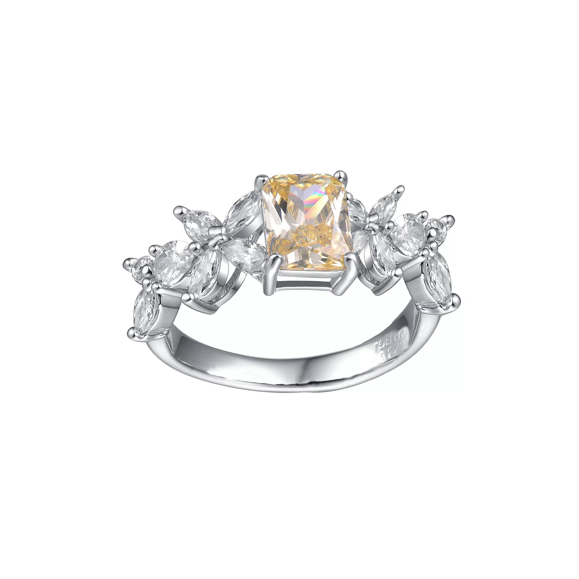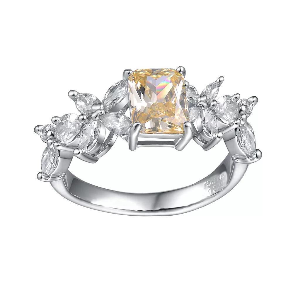 Profess your love with this stunning Canary yellow & white cubic zirconia & diamond accent radiant leaf trellis cluster engagement ring. Click on this JEWELRY & WATCHES GUIDE to learn about fit, styles, materials and more! Profess your love with this stunning Canary yellow & white cubic zirconia & diamond accent radiant leaf trellis cluster engagement ring. Click on this JEWELRY & WATCHES GUIDE to learn about fit, styles, materials and more! FEATURES Width: 2.6 mm Shank style: anniversary Band fit: comfort fit Metal: brass, sterling silver Plating: silver tone Finish: polished Packaging: velvety pouchSTONE DETAILS Stone type: cubic zirconia Total weight: 4 1/10 ct. Center stone weight: 2 3/4 ct. Center stone size: 7 mm x 9 mm Shape: emerald cut Setting: prongDIAMOND DETAILS Total weight: 3 ct., 3 1/8 ct. Center stone weight: 2 7/8 ct. Shape: baguette cut Setting: prong Diamond weights are approximate. Diamond Total Weights may vary between .01 and .13 ct. Some diamonds consist of fewer than 17 facets. Gemstones may have been treated to enhance their appearance. Special care may be required. Please visit our Gemstone Treatment & Special Care Guide for more information. Gender: female. Age Group: adult.
