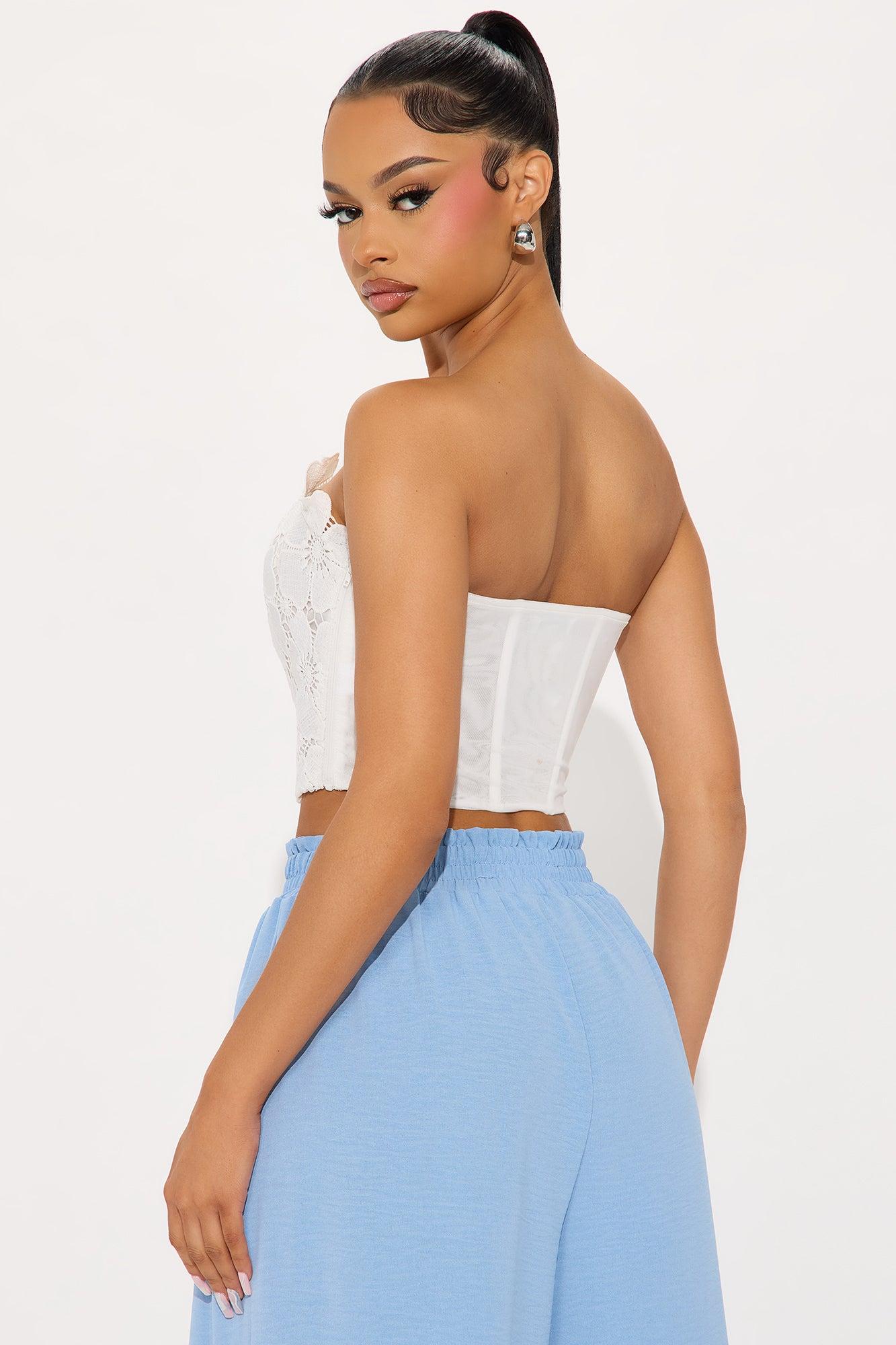 Available In Black And White. Lace Corset Top Non Stretch Boning Side Zipper Lined Self Front:100%Polyester Self Back: 90%Nylon 10%Spandex Imported California Proposition 65WARNING: Cancer and Reproductive Harm - www.P65Warnings.ca.gov.