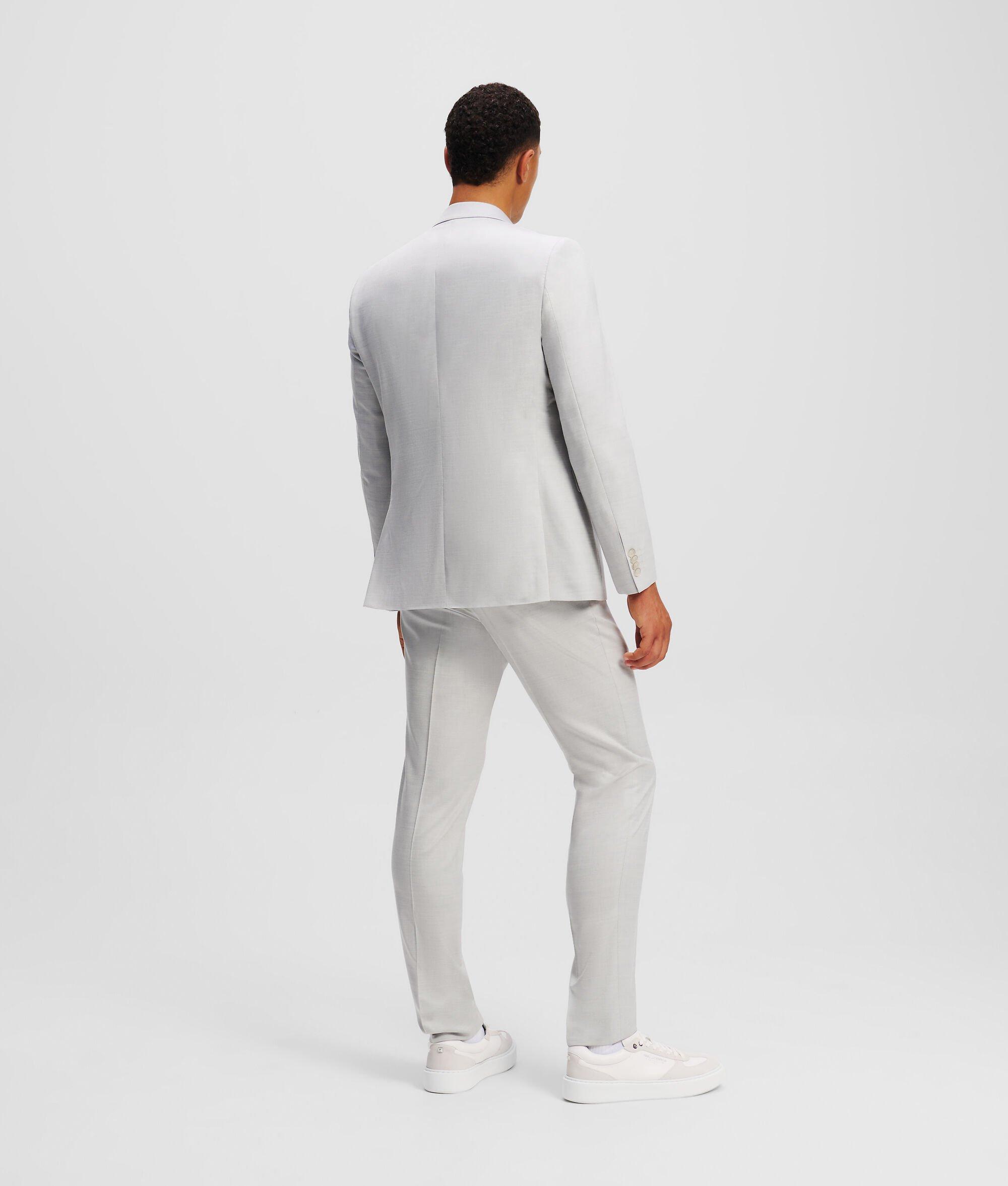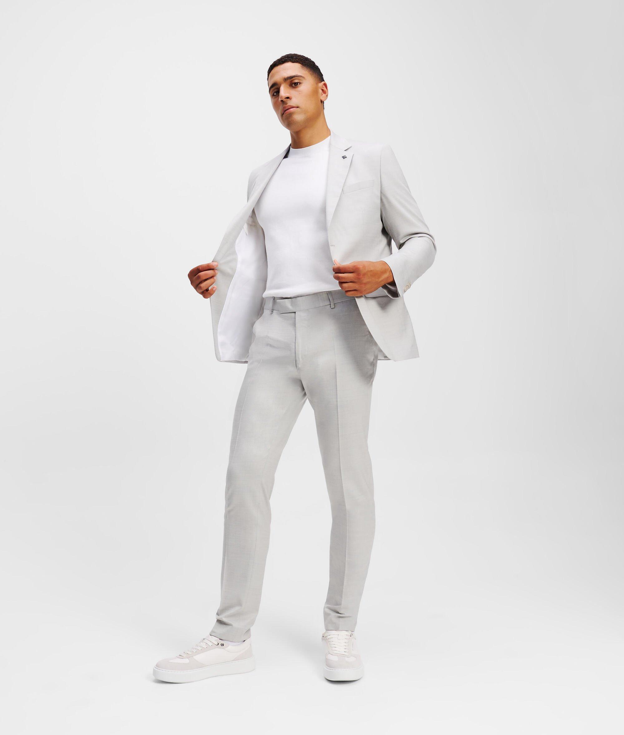 A statement two-piece suit that embodies timeless elegance. The classic single-breasted jacket features a button fastening and flap pockets, while tailored pants complete the refined look. The KARL LAGERFELD logo adds a touch of distinction.