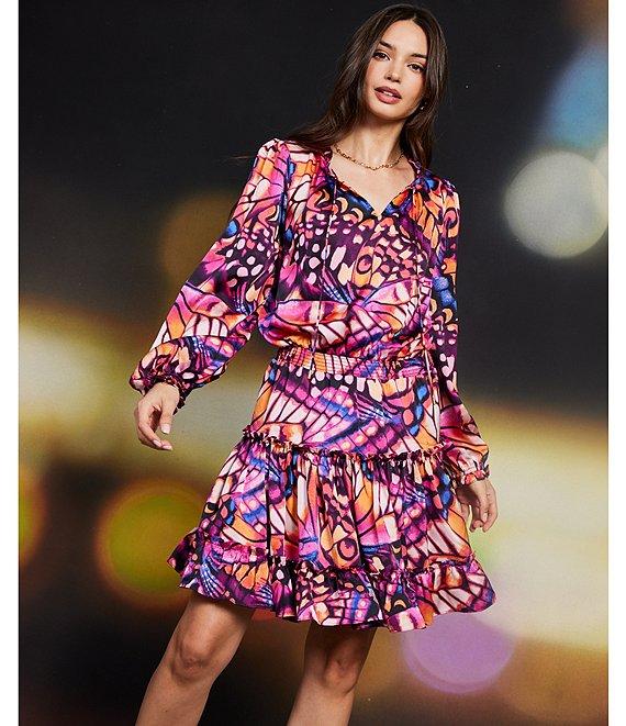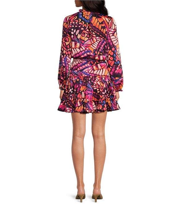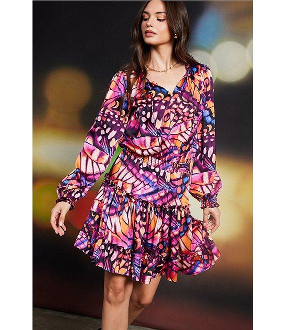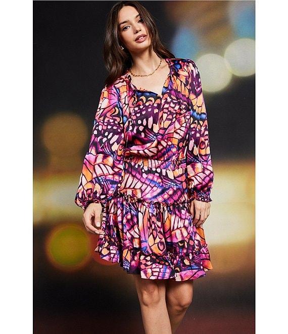 Skies Are Blue Butterfly Print Split V Neck Long Sleeve Mini Dress