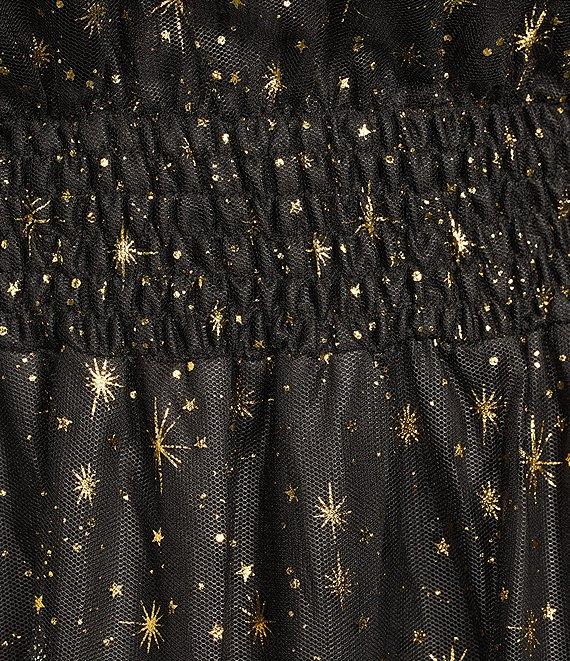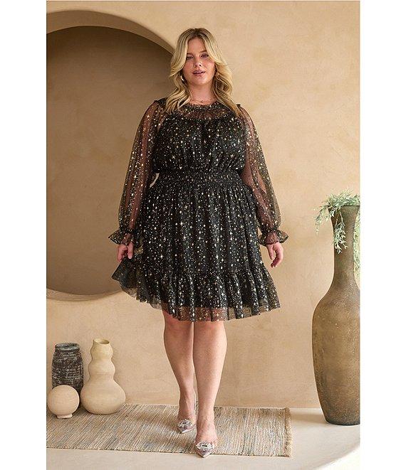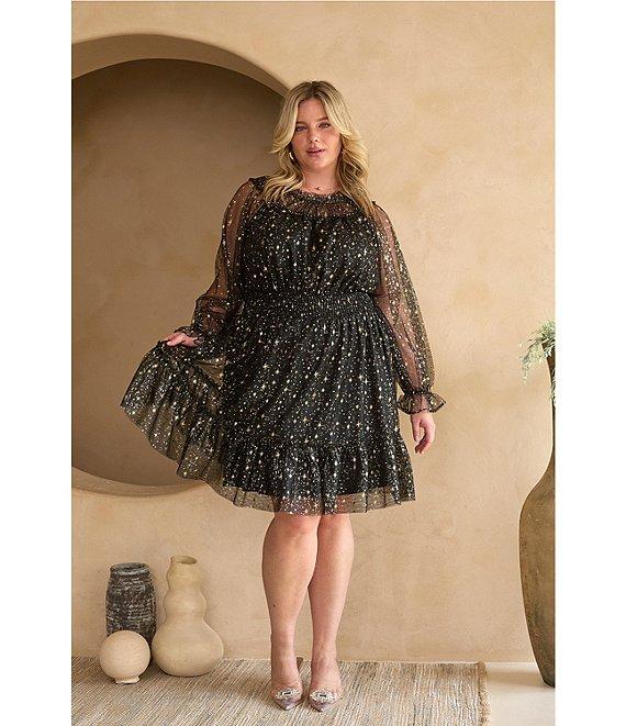 From Skies Are Blue Plus, this dress features: Foil mesh fabrication Round neckline Long sleeves Tiered skirt detail Pullover construction Foil star print detail Approx. 41" length Self: polyester Lining: polyester/spandex Hand wash Imported.
