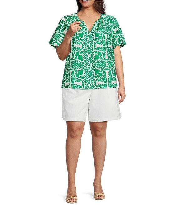 From Skies Are Blue Plus, this blouse features: Allover print Split neckline Bubble short sleeves Pullover styling Viscose/nylon Machine wash/line dry Imported.