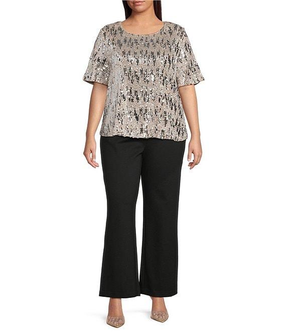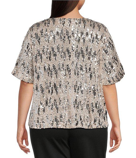 From Skies Are Blue Plus, this top features: Sequin fabrication Crew neckline Short sleeve Pullover construction Approx. 26.5" length Self: polyester Lining: nylon/spandex Hand wash Imported.