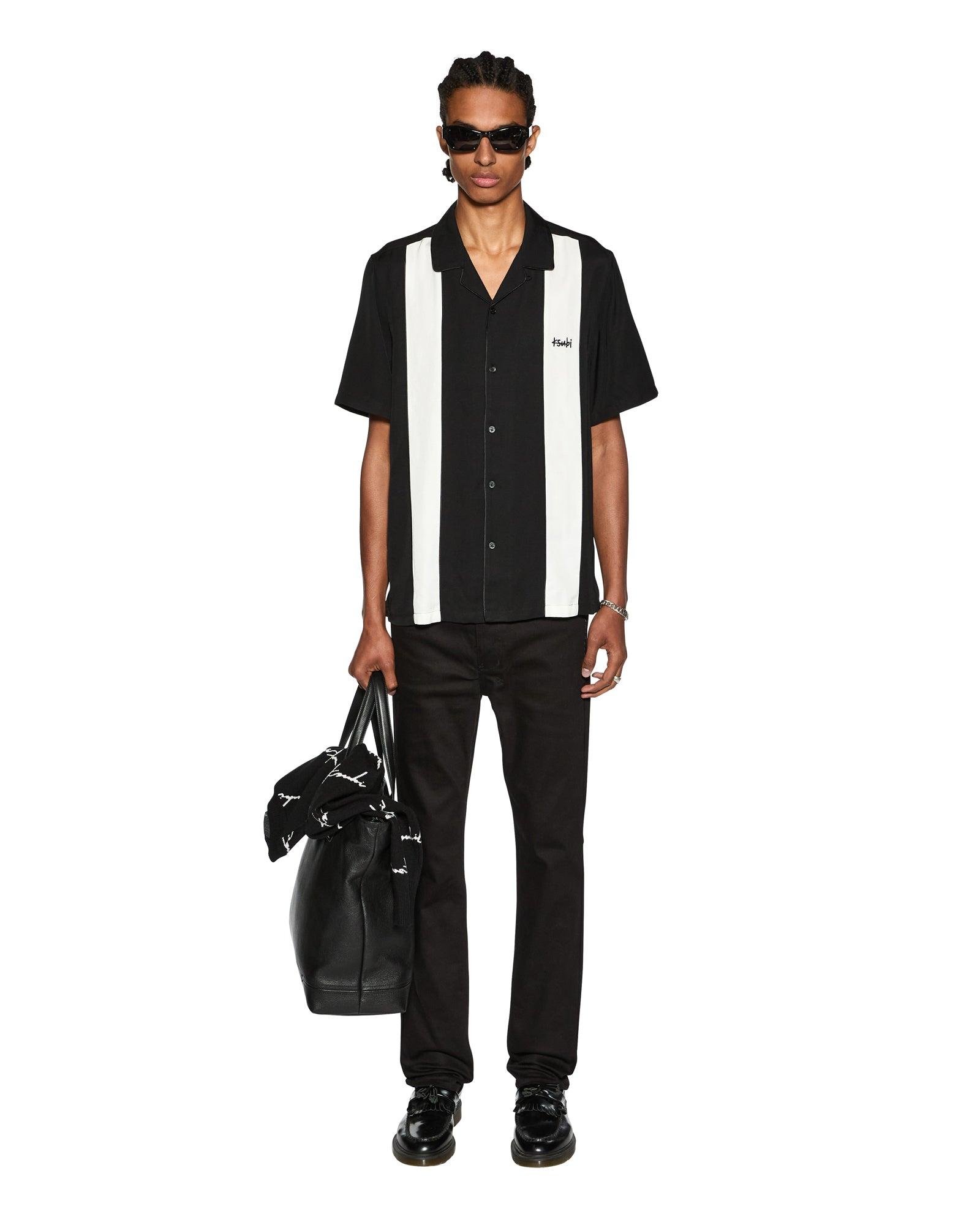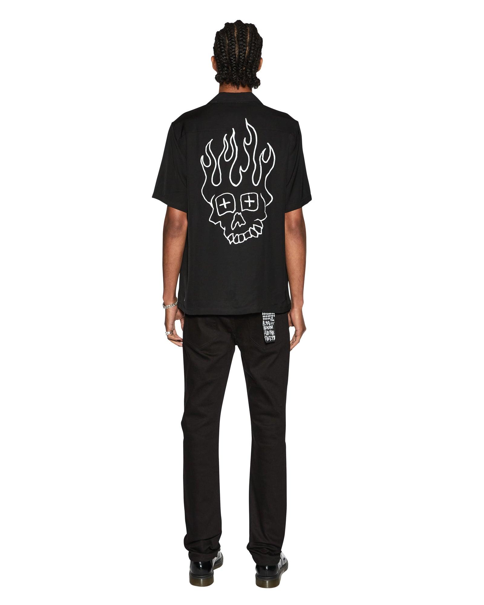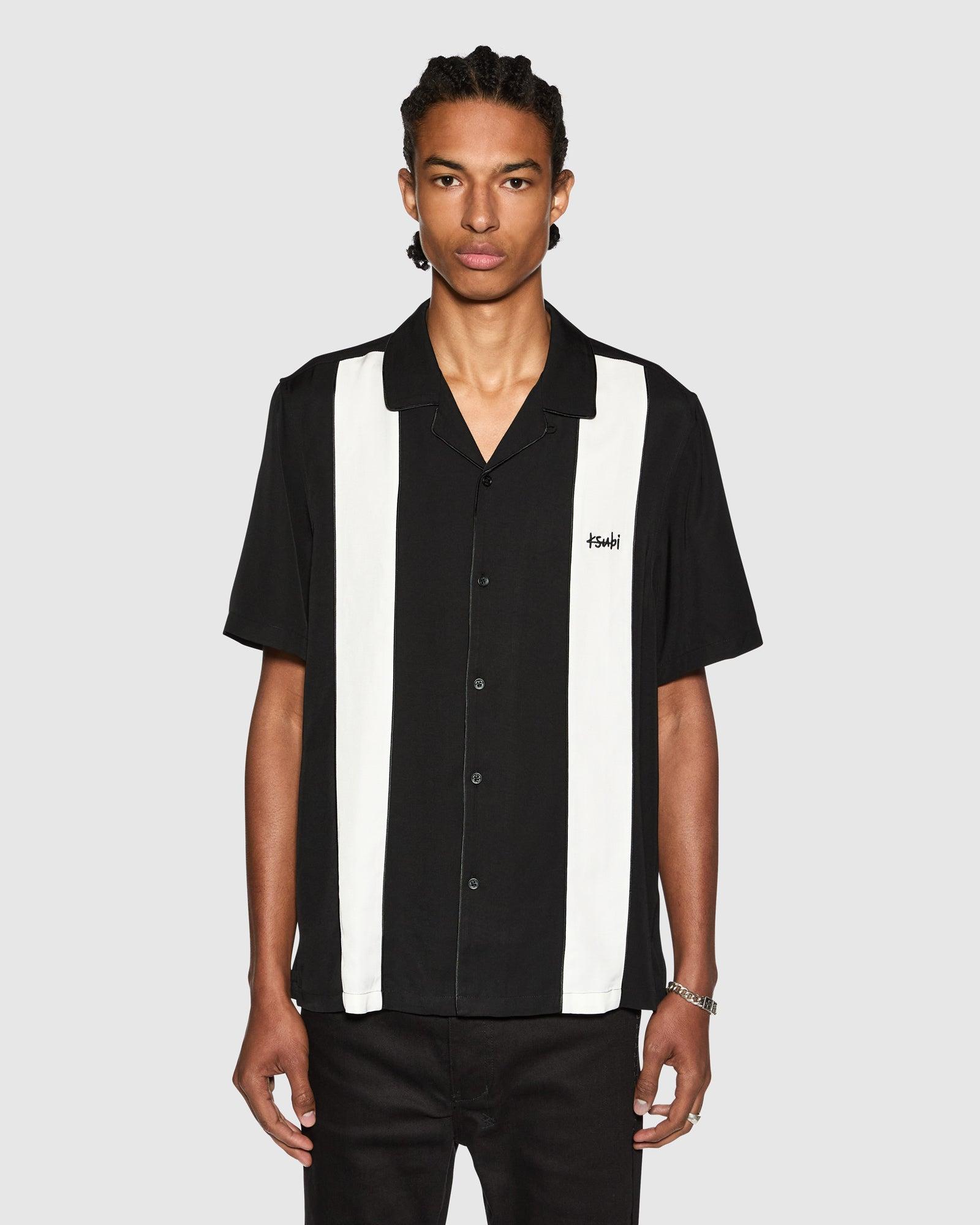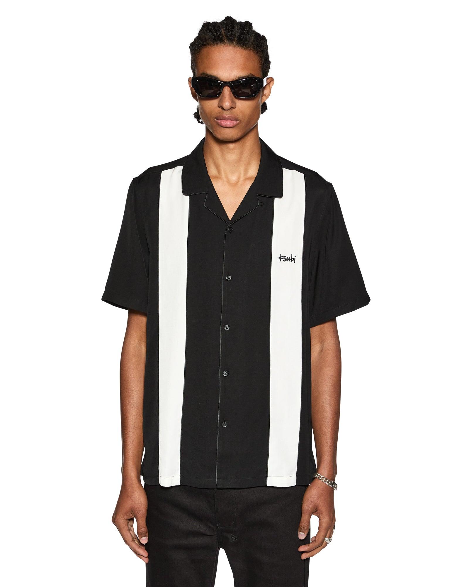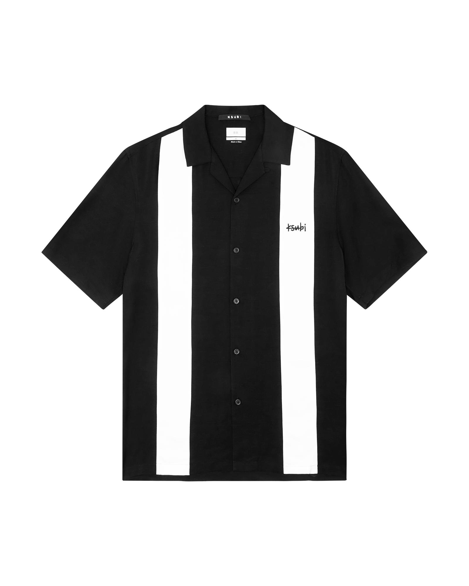 The Skull Alley Dwntwn Short Sleeve Shirt Black is a relaxed-fit short sleeve resort shirt with a step hem, made from a premium viscose blend in white. It features contrast bowling shirt panels with seam piping, a Ksubi 1999 logo at the chest, seasonal artwork at the back, and is finished with branded buttons and signature Ksubi t-box embroidery branding.