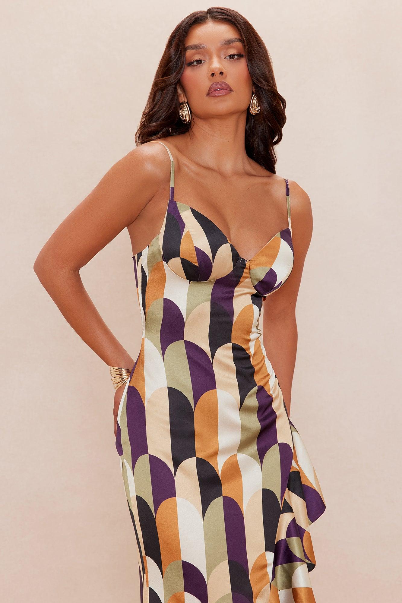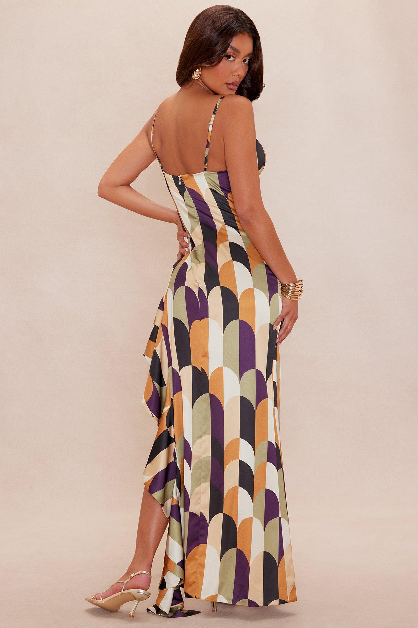 Available In Sage/combo. Satin Maxi Dress Adjustable Spaghetti Straps Padded Bra Cups High Side Slit Ruffle Detail Back Zipper Closure Lined Slight Stretch Disclaimer: Print Placement May Vary Shell: 97% Polyester 3% Spandex Lining: 95% Polyester 5% Spandex Imported