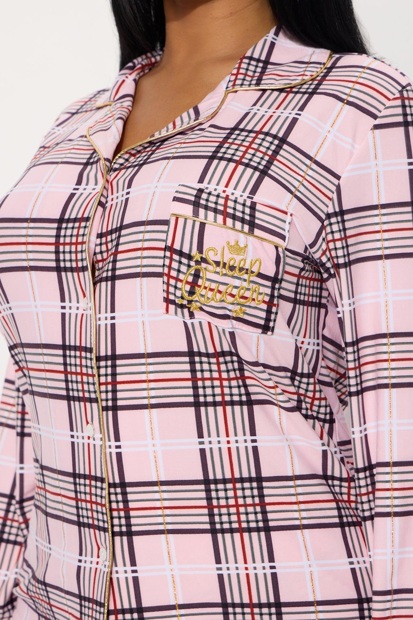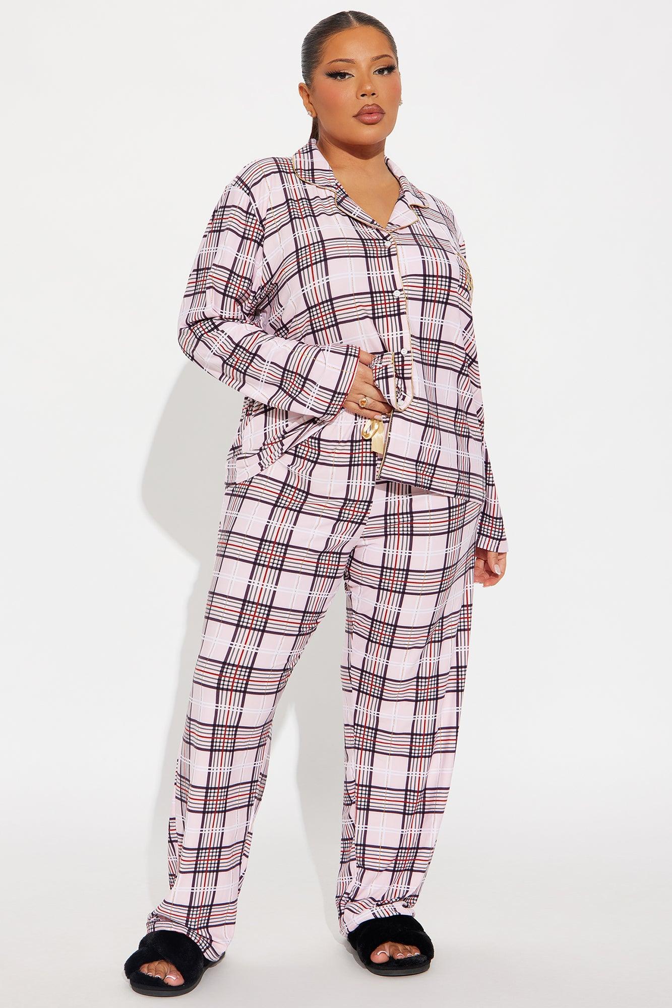 Available In Pink/combo. PJ Pant Set Long Sleeve Button Up Shirt Collar Glitter Embroidered Chest Pocket Matching Pant Elastic Waistband Plaid Print Stretch Final Sale Disclaimer: Plaid Placement Will Vary. Self: 95% Polyester 5% Spandex Imported