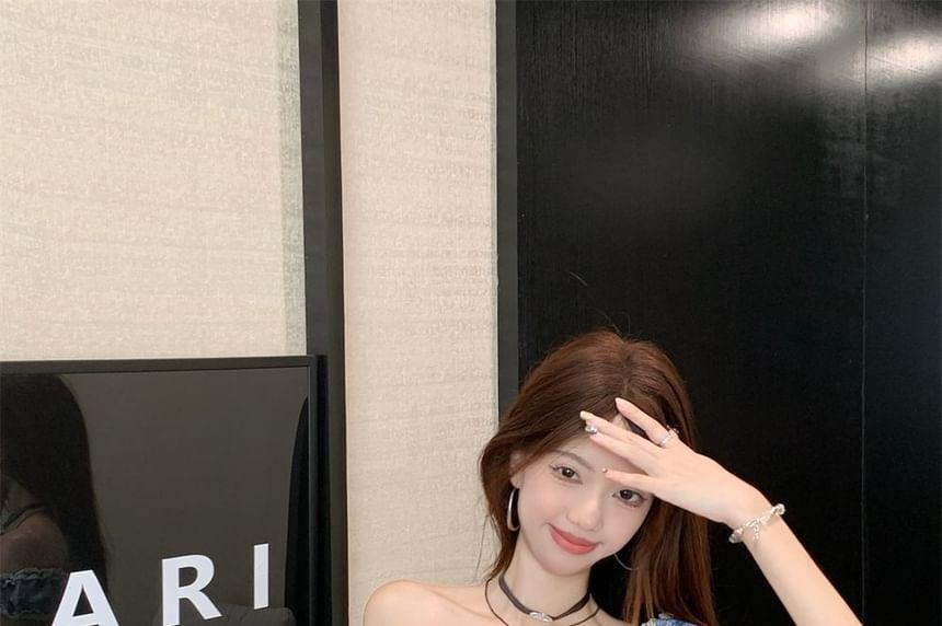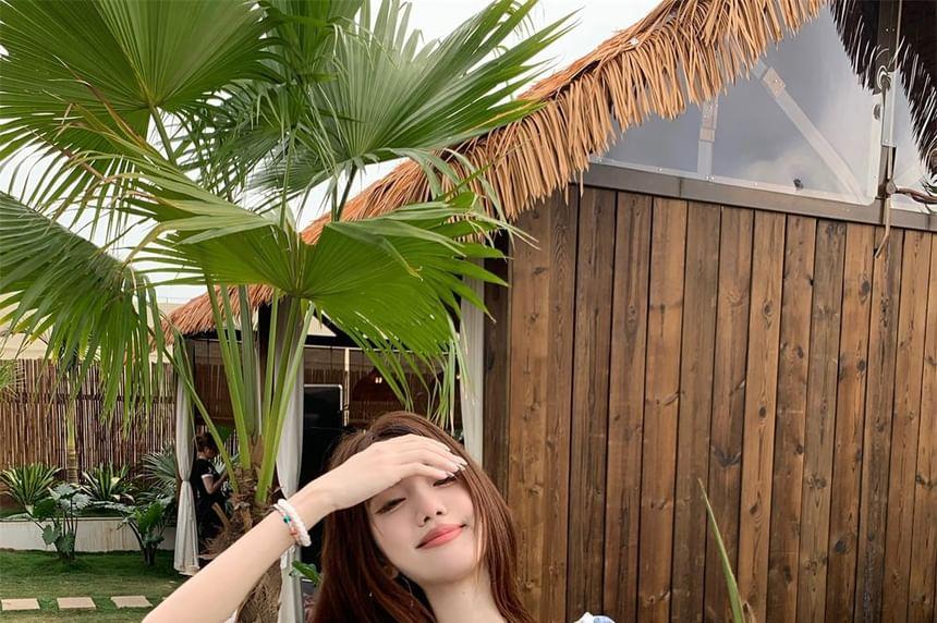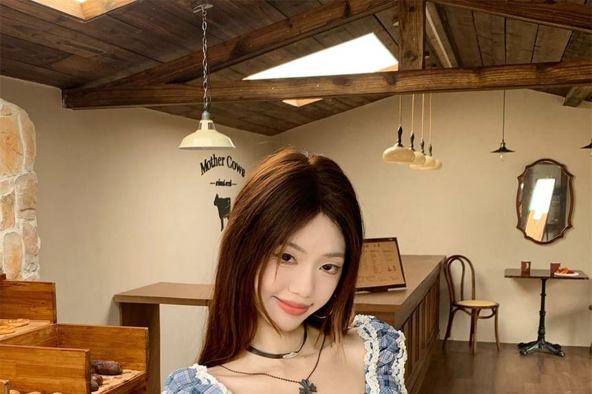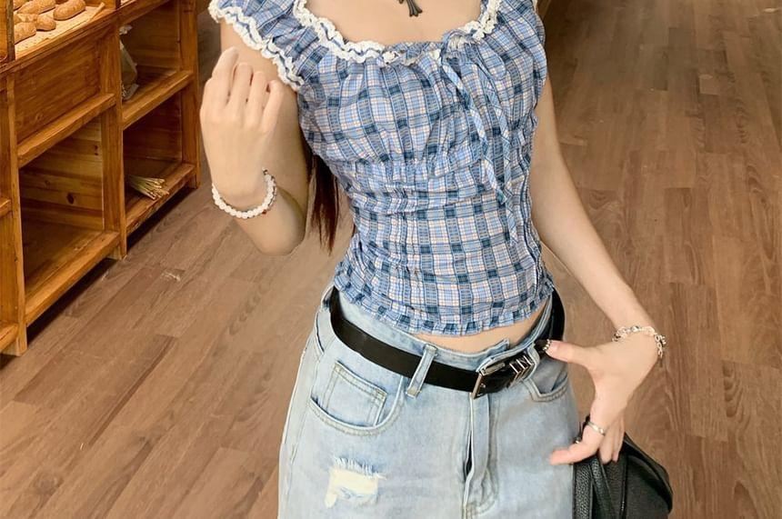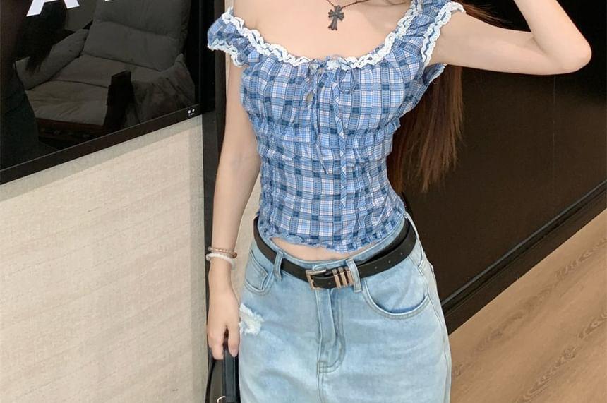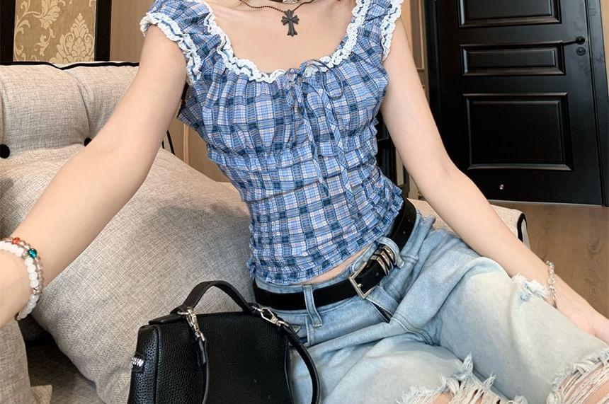 Sleeveless Scoop Neck Plaid Frill Tie Front Top