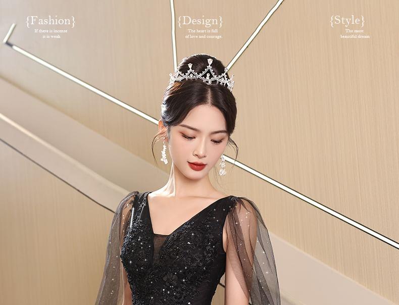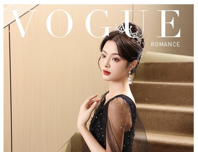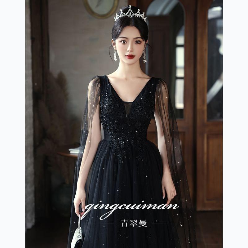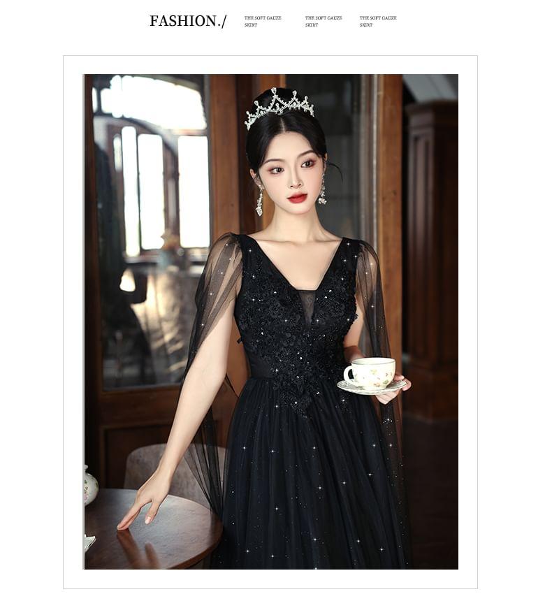 Sleeveless V-Neck Mesh Panel Floral Accent Sequin A-Line Evening Gown