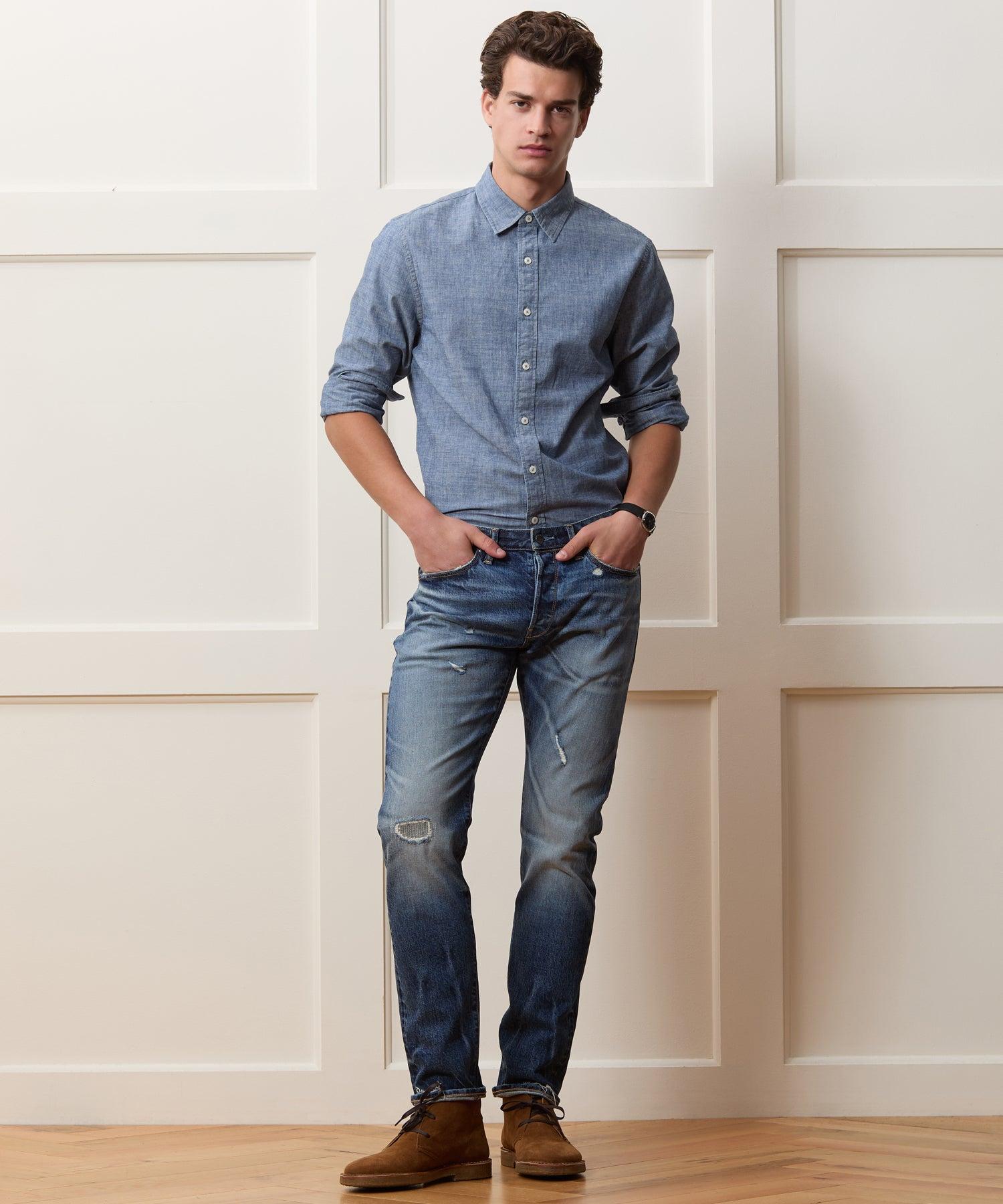 Our premium Selvedge jeans are imported Japanese denim that comes to us from a boutique mill in the Okayama prefecture where the denim was woven on an old-shuttle loom, loaded with quality, vintage-inspired details, including a shank button fly and gunmetal rivets. There are also genuine selvedge outseams; when you turn up your cuff, you'll spot that giveaway red ticking at the edge. Our Slim Fit is trim (but not tight) at the top and tailored through the thigh, tapering at the ankle. Dyed a classic indigo before getting patched and distressed, these jeans are an homage to all the vintage jeans Todd's known and loved. PS: each pair comes with a raw selvedge hangtag; keep it, and you can patch any wear and tear down the line. 98% Cotton, 2% Elastane ; 12.5 oz Denim ; Slim Fit ; 14 Leg Opening (Based on Size 32W) ; Shank Button Fly ; Genuine Selvedge ; Gunmetal Rivets ; Fabric From Japan ; Garment Made in Vietnam ; Machine wash cold inside out with like colors, delicate cycle. Non-chlorine bleach only, when needed. Tumble dry low, low iron. ; Style JE033054 ;