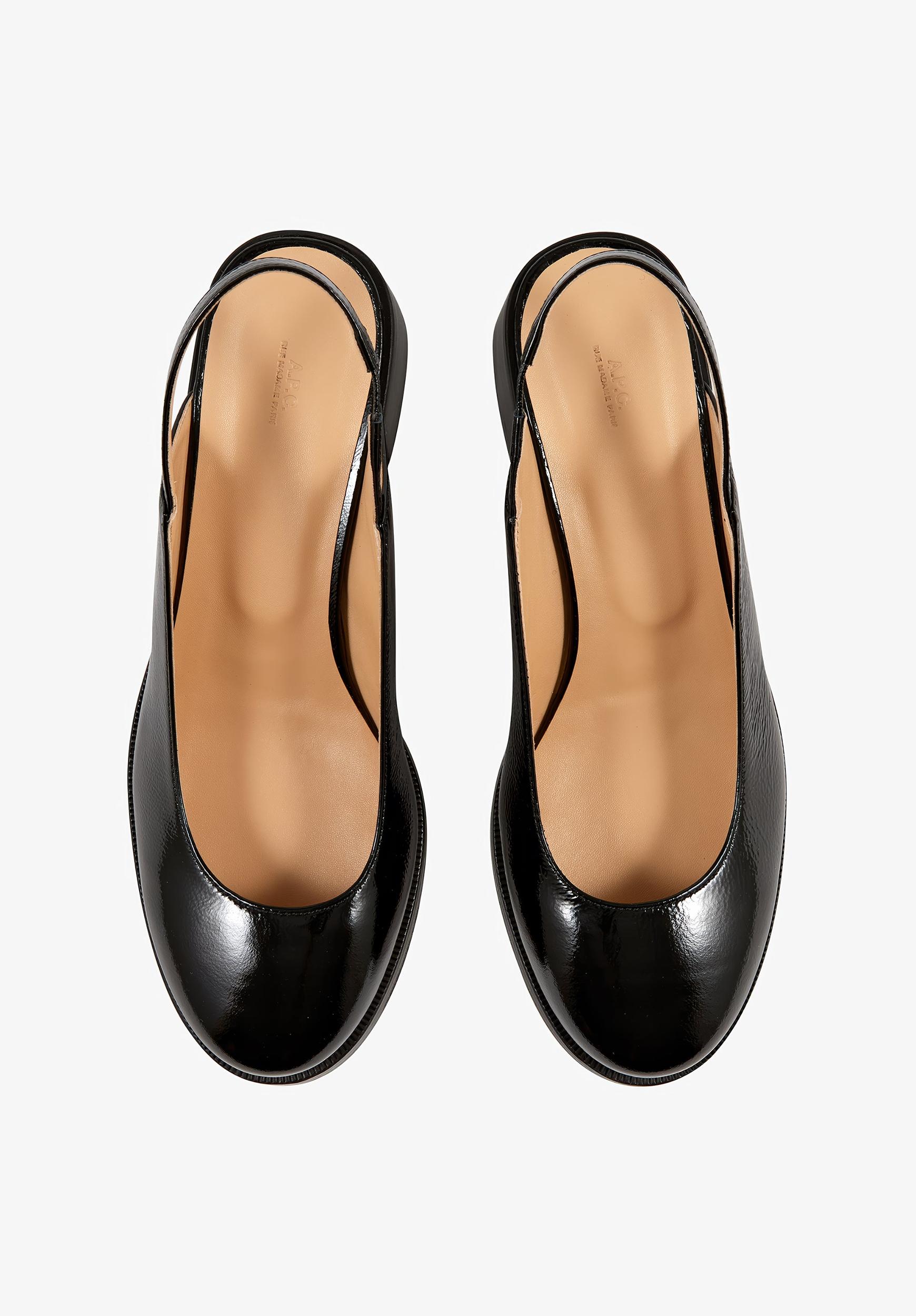 - Shoes in crinkled patent leather. - Strap adjusts with a metal buckle at the heel. - Smooth leather insole.