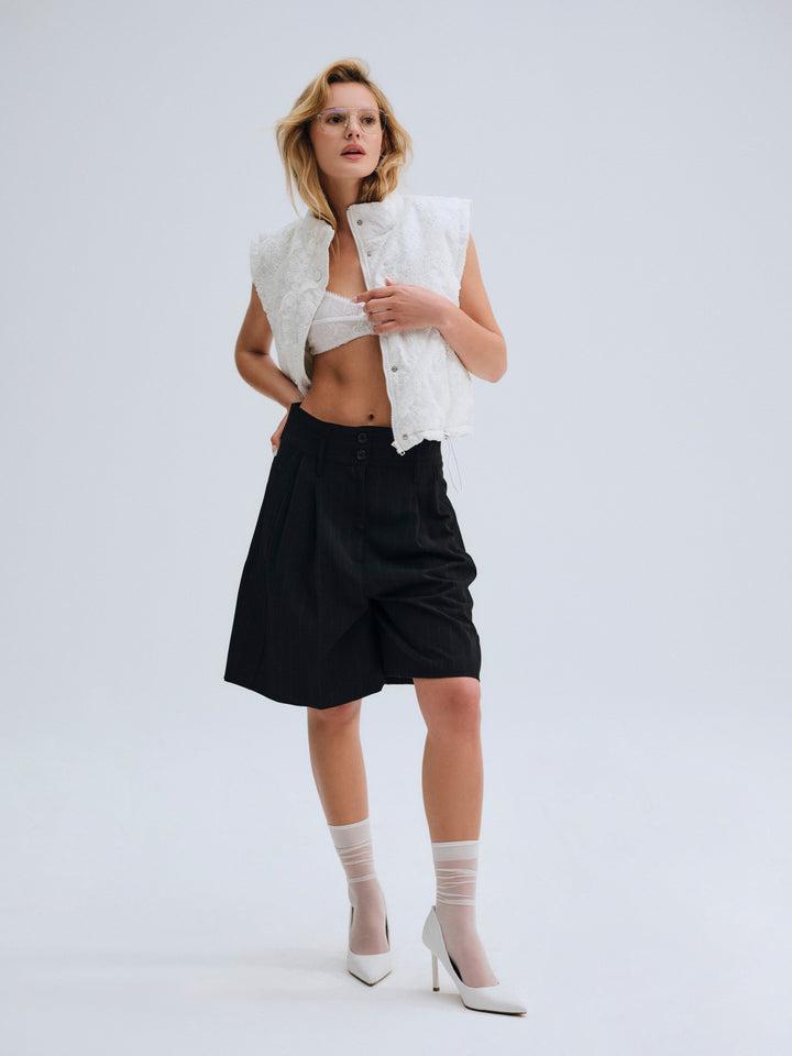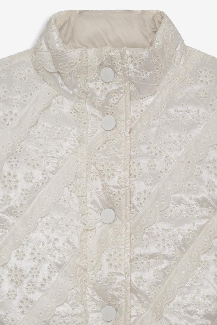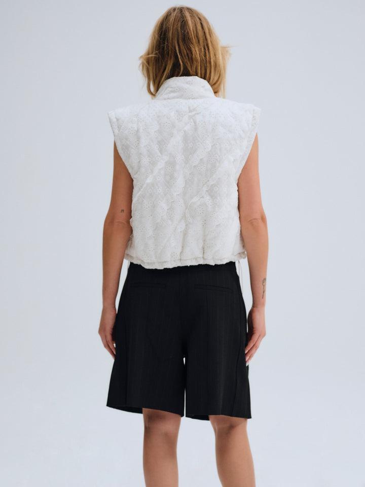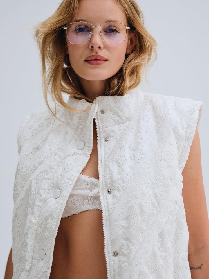 For Love & Lemons Essentials: Crafted for the busy Muse, the Sloane white puffer vest is crafted in an ultra-feminine patchwork with striking eyelet trims. This sleeveless puffer jacket is cut to a cropped length with functional metal snap buttons and a drawstring waist for cinching.