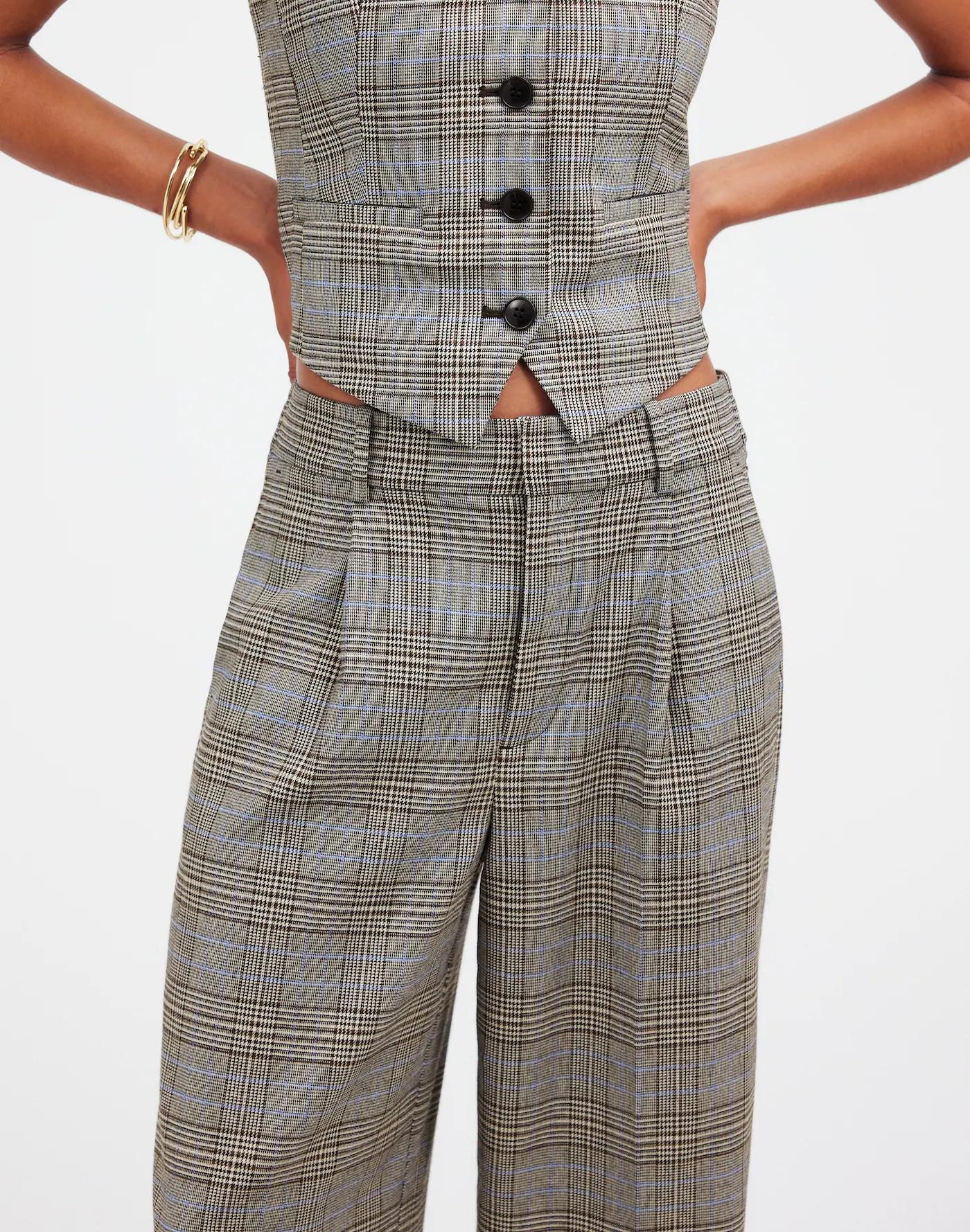 Coming in yarn-dyed plaid fabric, these mid-rise pleated pants sit naturally at the waist with a slight dangle and have slouchy, straight legs. Refined with a cool vibe, they can be worn with everything from a classic tee to a cozy knit.