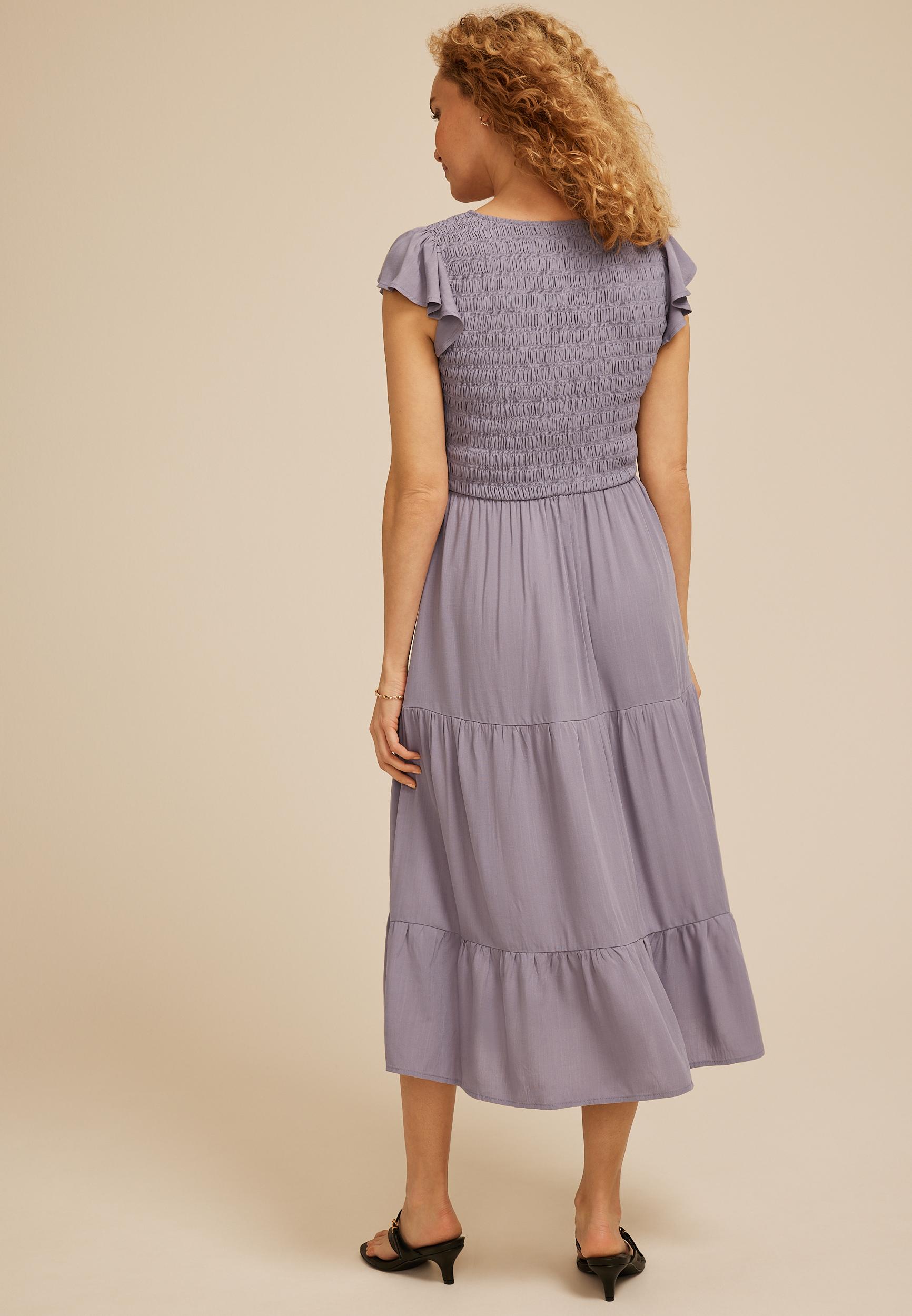 There’s an easy sweetness to this dress, the kind that makes every moment feel a touch softer. The smocked bodice hugs gently for a flattering, comfortable fit, while the flutter sleeves bring a hint of movement that feels effortlessly feminine. With each step, the tiered skirt drifts around you, creating a graceful silhouette that feels light, airy, and beautifully relaxed. It’s the perfect piece for days when you want comfort to meet quiet romance—simple to slip into, lovely to move in, and destined to become a go‑to for your most effortless, heart‑warming outfits. Style it with delicate gold jewelry, a strappy sandal, and a woven tote for daytime charm, or add a lightweight wrap and low block heel to bring out its evening softness. This is the dress that makes getting ready feel beautifully simple. .mar-pdp-section .mar-product-description {color: #000;}.mar-pdp-section .mar-product-description ul, .mar-pdp-section .mar-product-description ul>li {margin-left: 10px;padding-left: 10px;}.mar-pdp-section .mar-product-description .mar-product-description-content ul li{list-style-type: disc;margin: 0 0 5px;padding-left: 5px;}.mar-pdp-section .mar-product-description p {color: #000;padding: 5px 0;}@media only screen and (max-width: 1023px){.mar-pdp-section .mar-product-description .mar-product-description-content ul li{list-style-type: disc !important;} .mar-pdp-section .mar-product-description .mar-product-description-content .mar-tab-content ul{padding-left: 10px;}.mar-pdp-section .mar-product-description .mar-product-description-content .mar-tab-content {font-weight: 300;}} Features: lightweight fabric solid versatile color v neckline short flutter sleeves smocked bodice that provides a comfortable stretch fit tiered skirt with gentle gathers for added movement and flow midi length falling below the knee