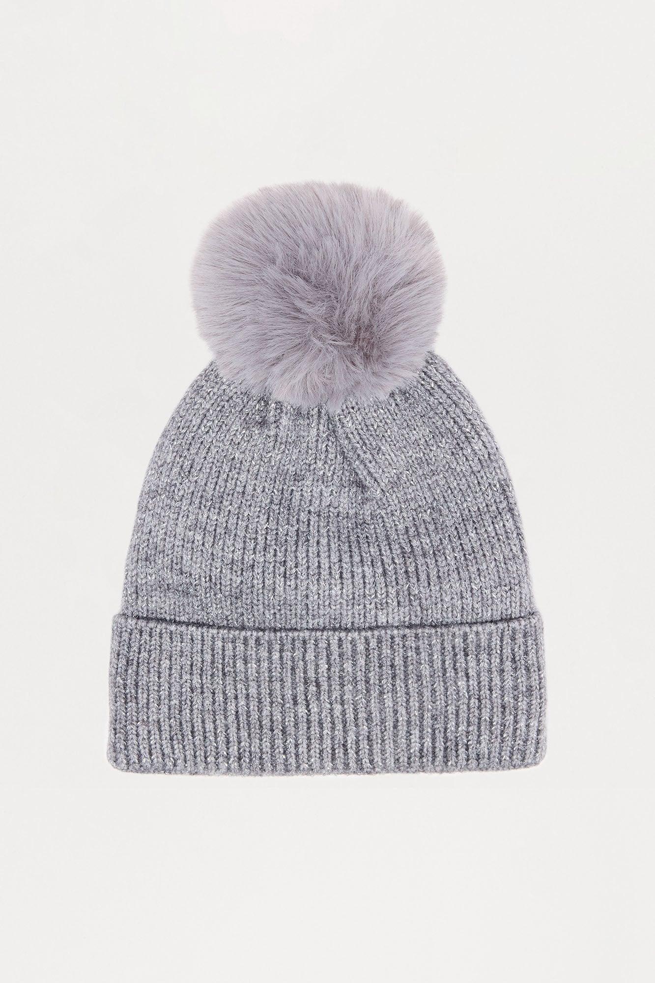 Available In Beige, Black, Grey And Pink. Beanie Pom Detail Glitter Detail Poly Blend Material 42% Acrylic 30% Polyester 28% Nylon Imported California Proposition 65WARNING: Cancer and Reproductive Harm - www.P65Warnings.ca.gov.