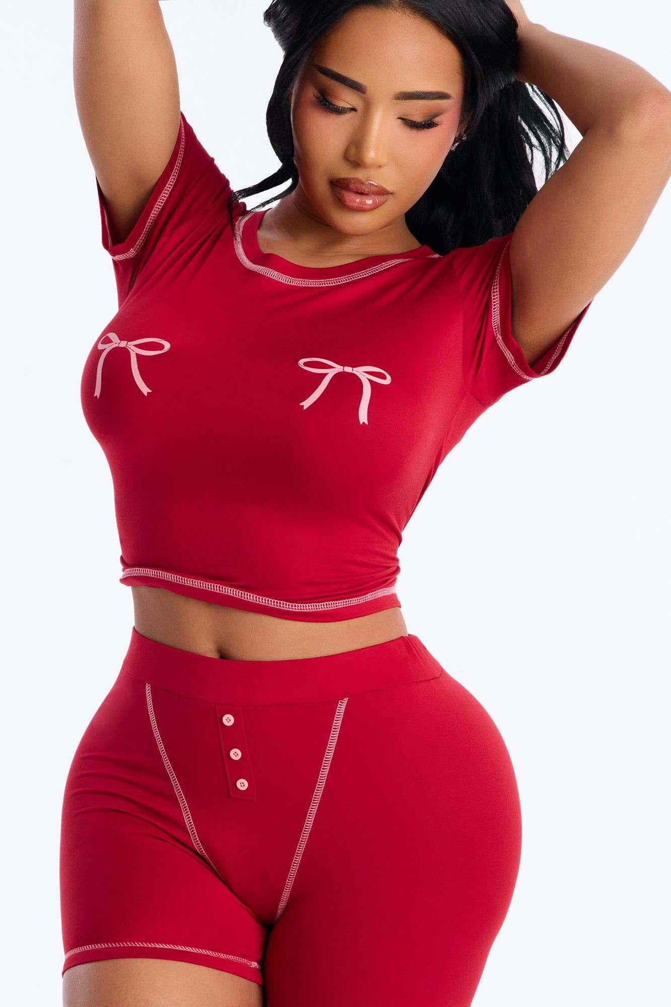 So Cute Bow PJ Boxer Short Set - DarkRed Female