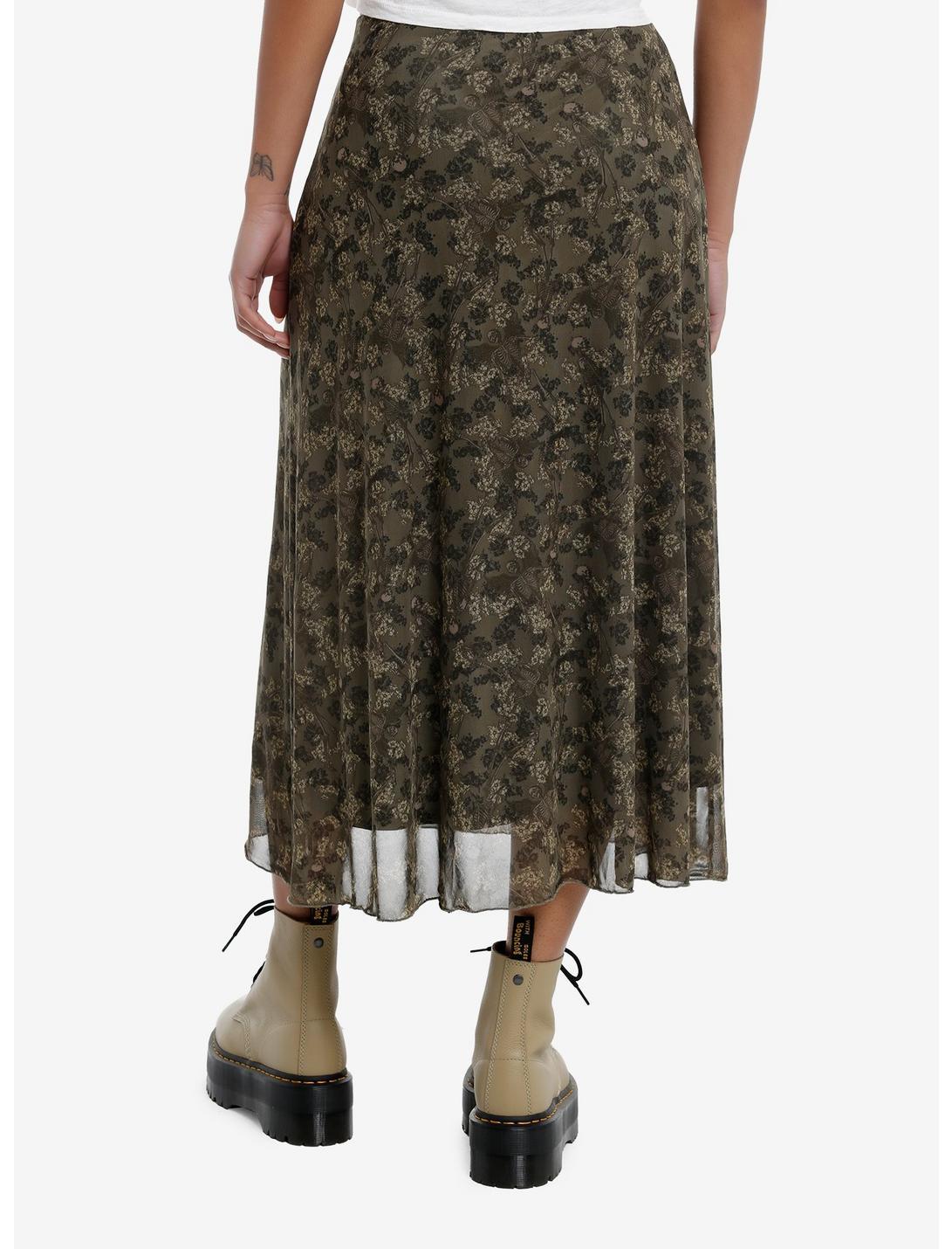 Social Collision Skeleton Flowers Green Mesh Midi Skirt
