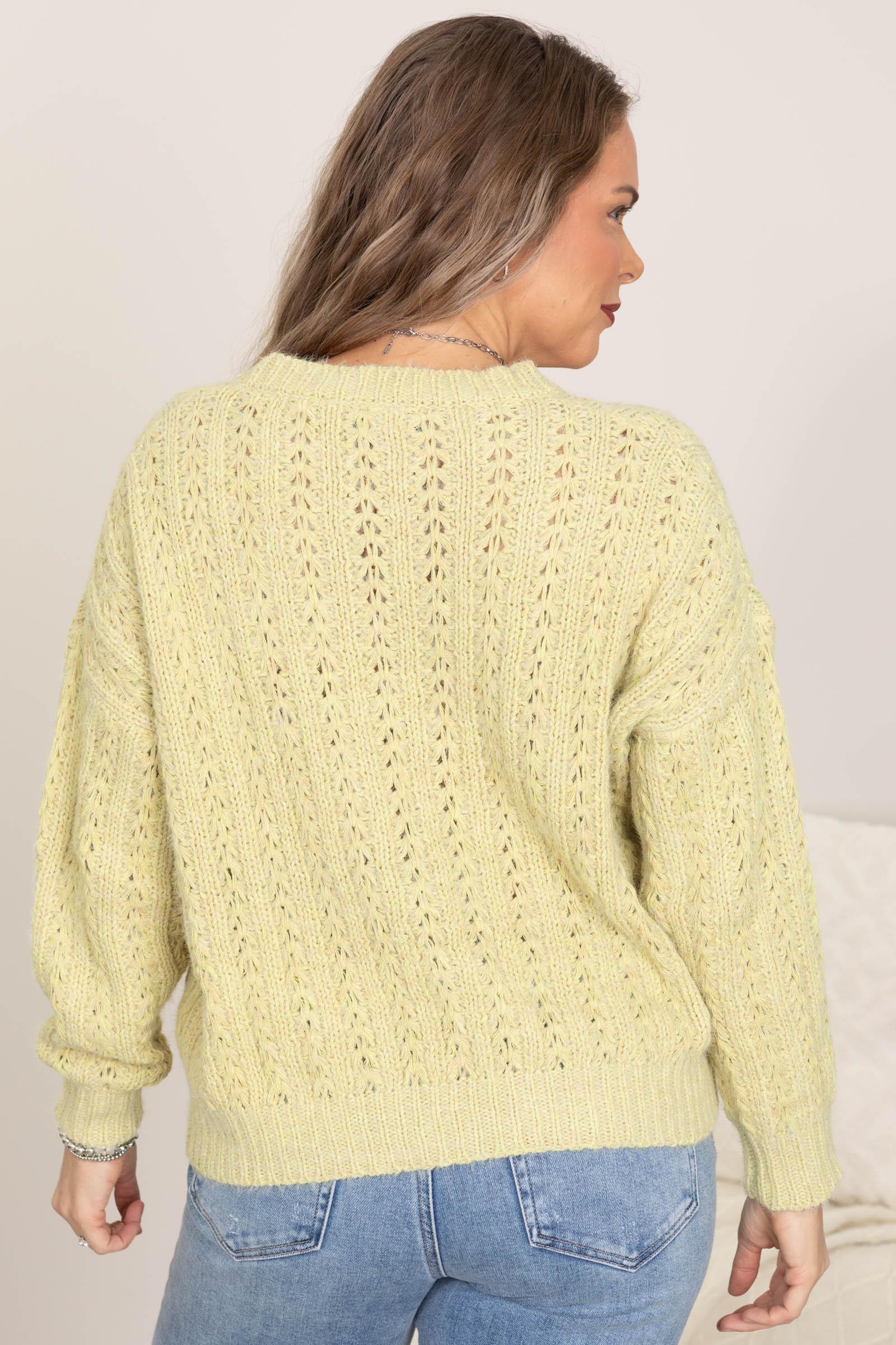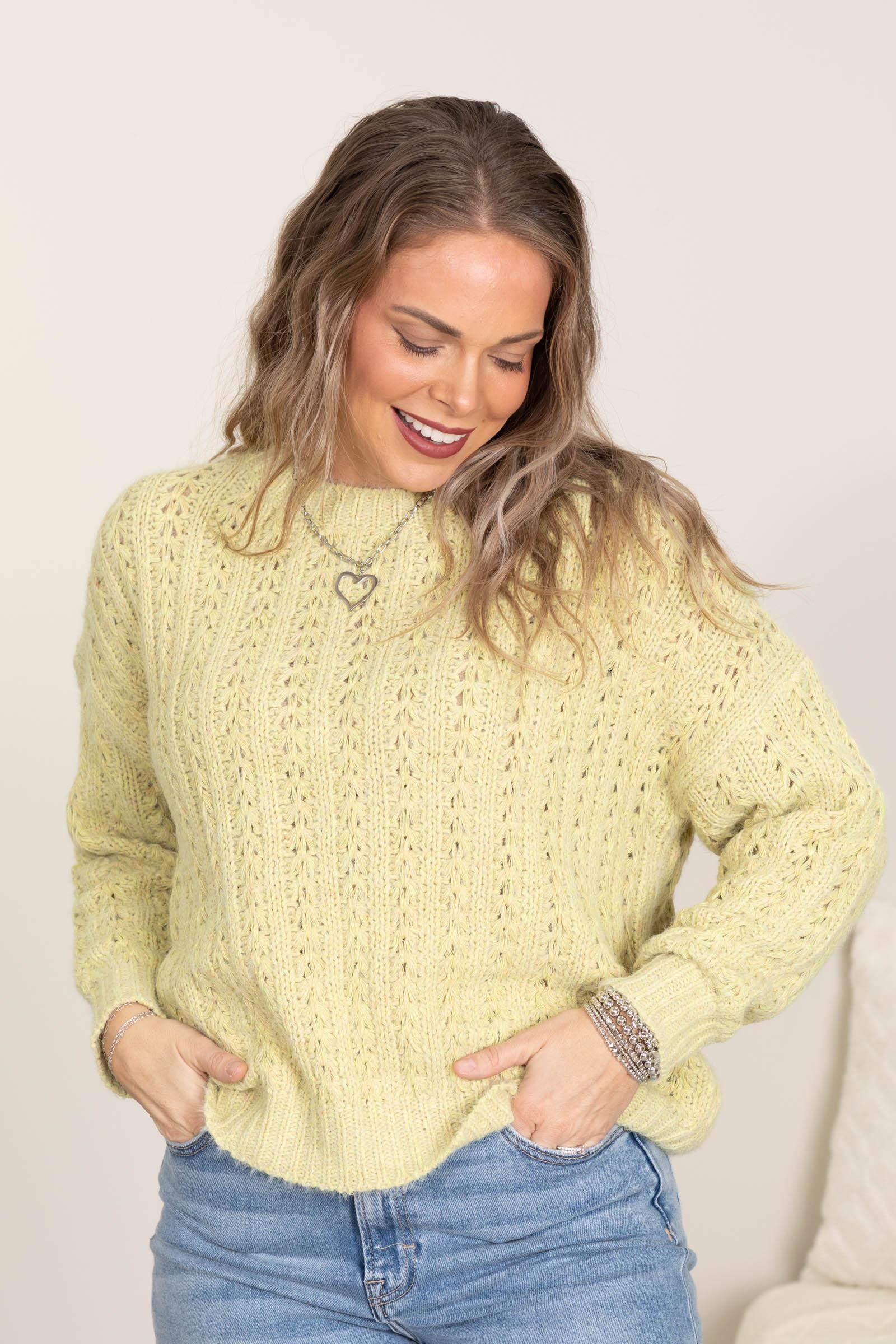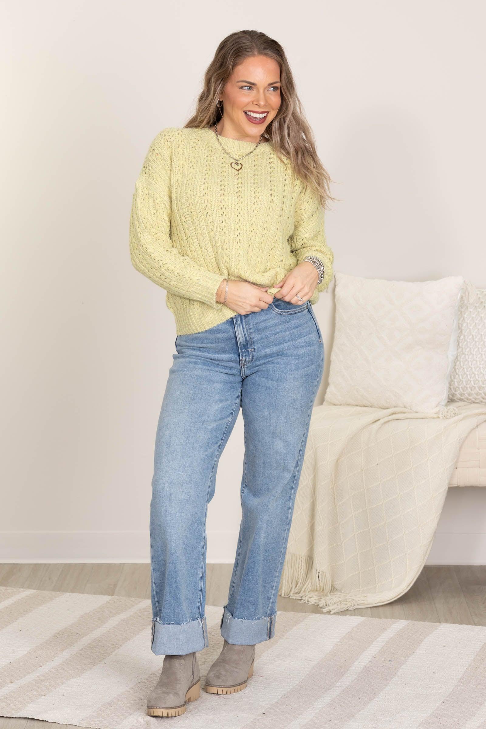 Product Details Colors: Light Blue, Pastel Yellow Print: Solid Neckline: Round Sleeve: Long Sleeve Hemline: Straight Brand: Timing Material and Care 70% Acrylic 25% Polyester 5% Wool Dry Clean Only Size and Fit Small: Bust 44" Waist 42" Length 22" Medium: Bust 46" Waist 44" Length 22.5" Large: Bust 48" Waist 46" Length 23" Erica is 5’7” and wearing her true size small