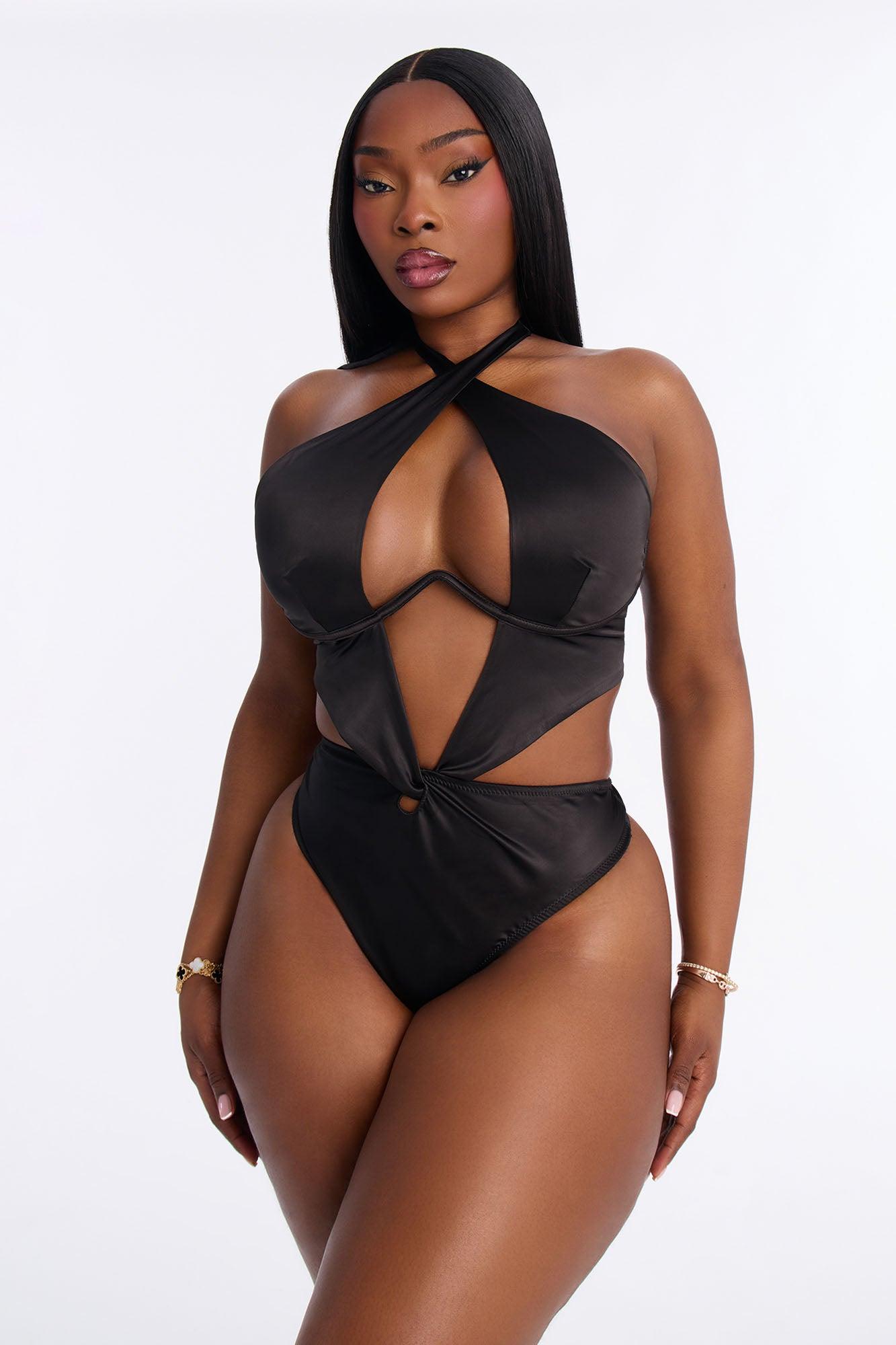 Available In Black And Red. Satin Teddy Halter Neck Adjustable Tie Underwire Twist Detail Cheeky Bottom Stretch Final Sale 92% Polyester 8% Spandex Imported California Proposition 65WARNING: Cancer and Reproductive Harm - www.P65Warnings.ca.gov.