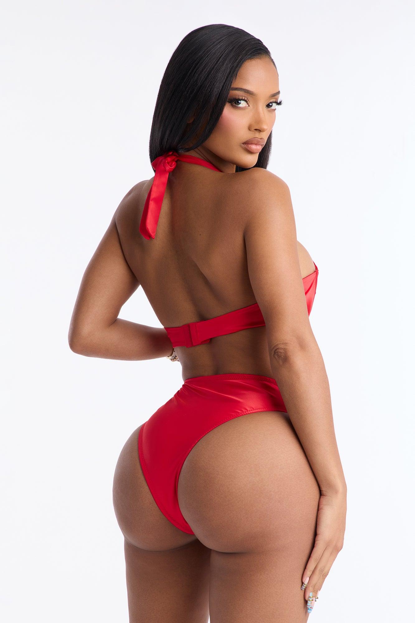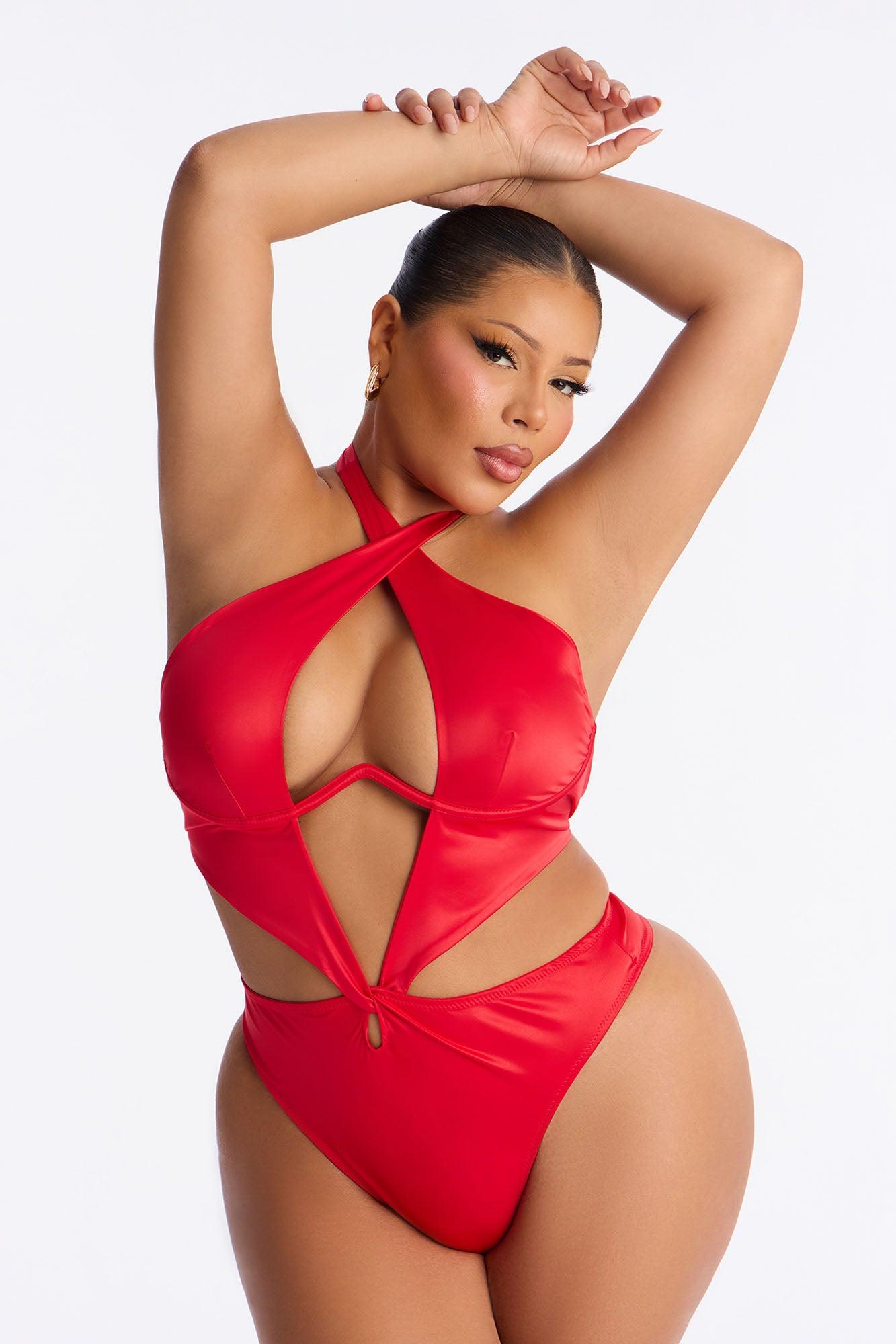 Available In Black And Red. Satin Teddy Halter Neck Adjustable Tie Underwire Twist Detail Cheeky Bottom Stretch Final Sale 92% Polyester 8% Spandex Imported California Proposition 65WARNING: Cancer and Reproductive Harm - www.P65Warnings.ca.gov.