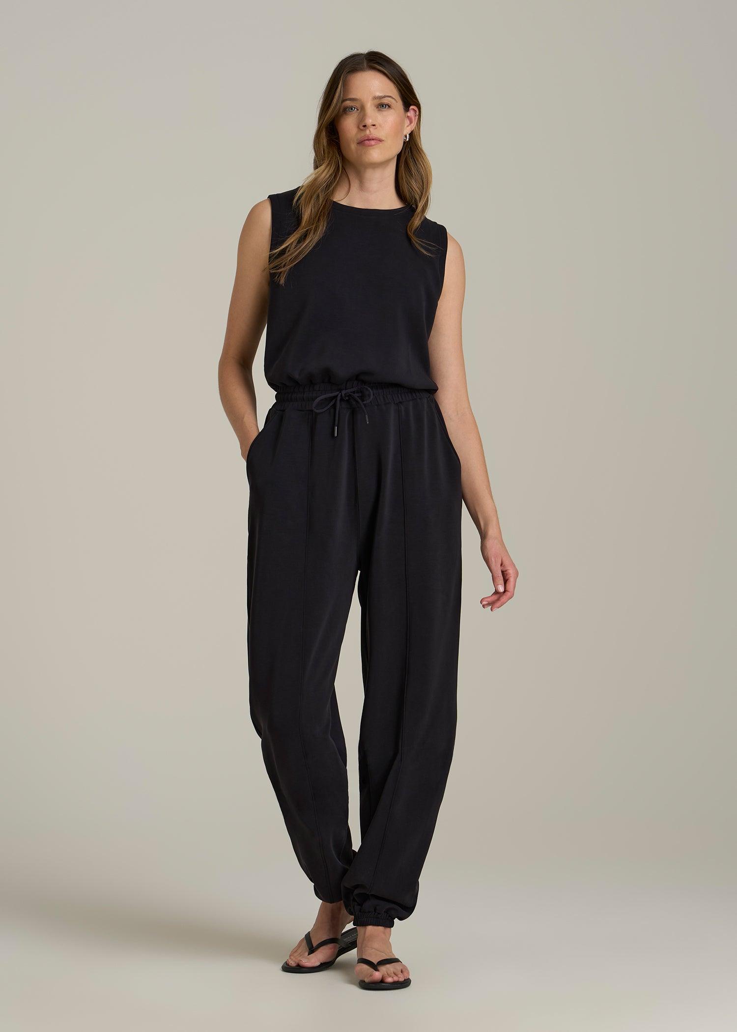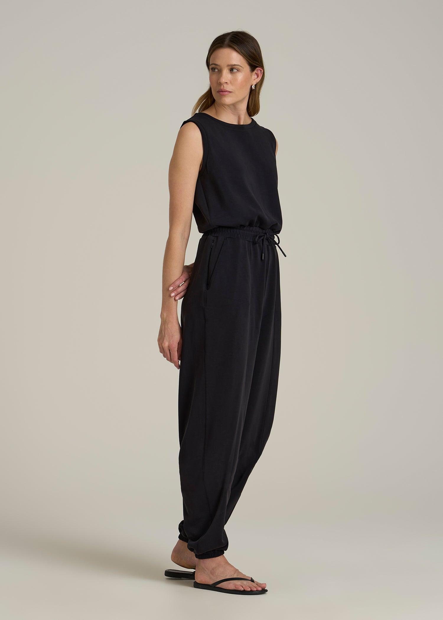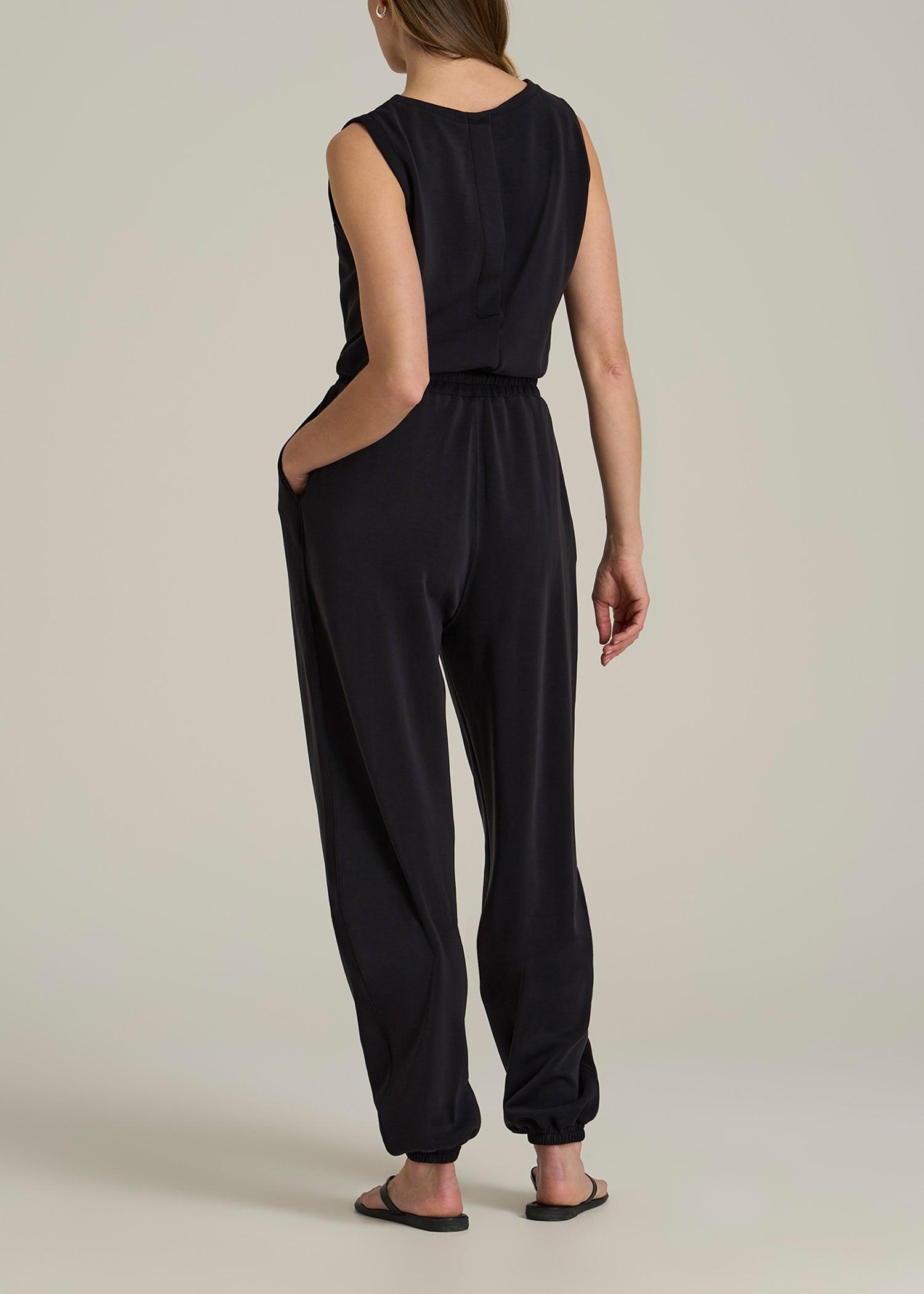 Get comfy-cool in our Soft Motion Sleeveless Sweatpant Tall Jumpsuit for ladies – it's casual style that’s anything but basic. Our sleeveless design meets a soft sweatpant vibe, making it a perfect off-duty staple. It’s time for women's tall jumpsuits that feel relaxed yet stylish.• Side seam and slash pockets for practicality• Open back detail with snap closure• Elastic waist with external drawstring for a perfect fit