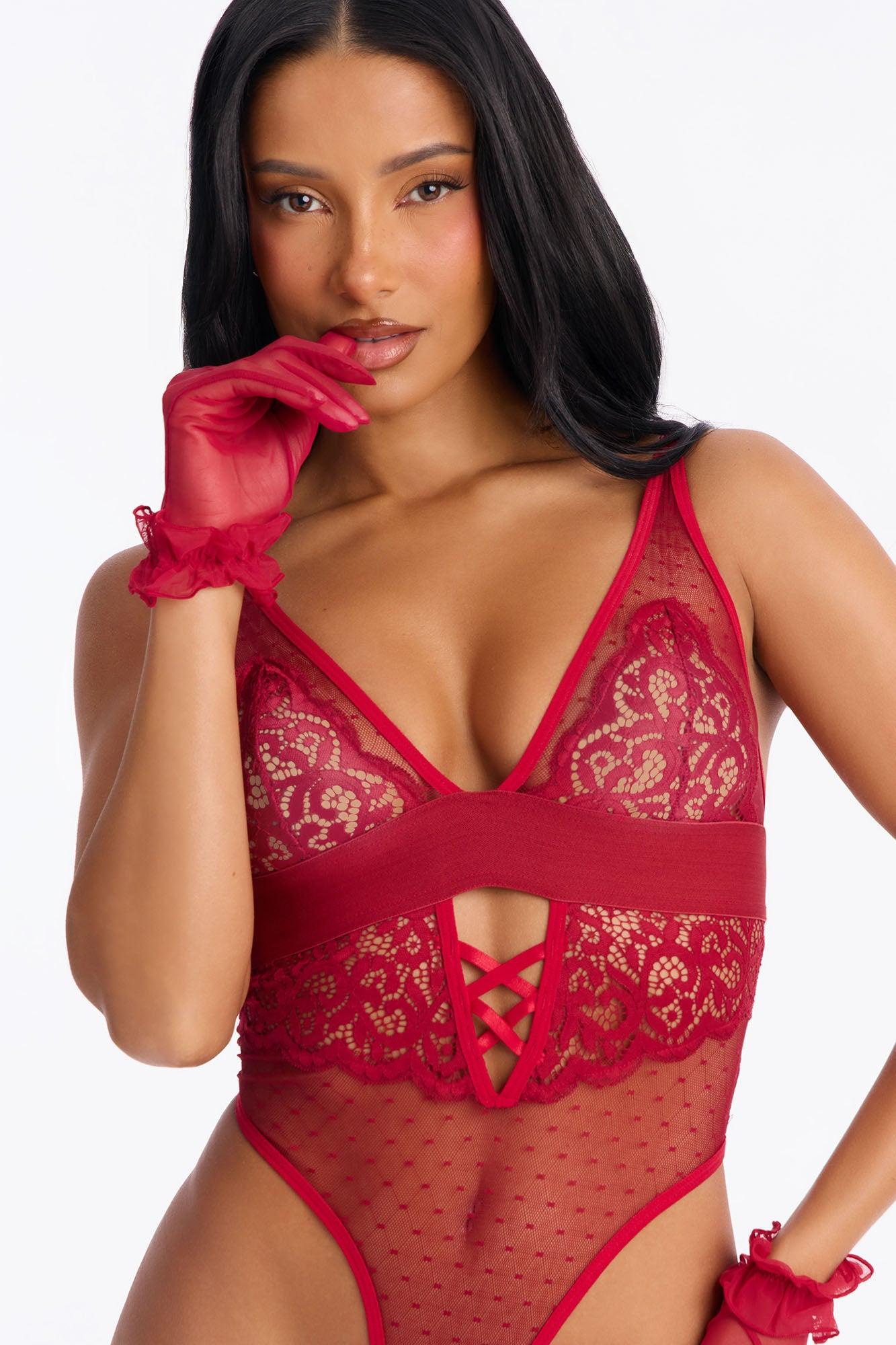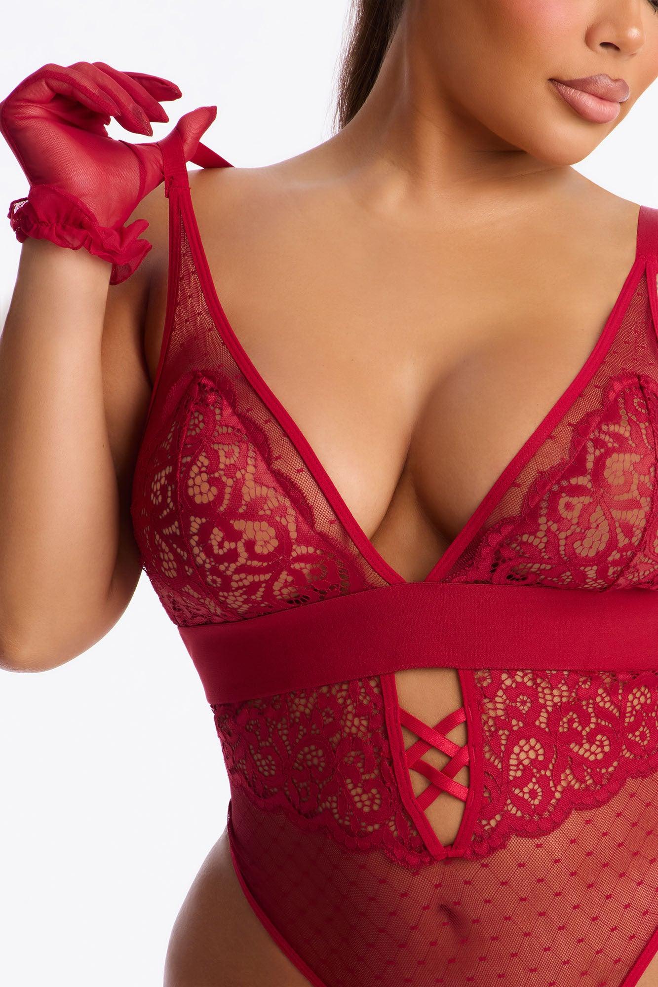 Available In Black And Burgundy. Mesh Lace Teddy Dotted Mesh Adjustable Straps Unlined Elastic Waistband Detail Lace Up Detail Matching Mesh Gloves Thong Bottom Final Sale Self: 100% Polyester Contrast: 95% Polyester 5% Spandex Gloves: 94% Nylon 6% Spandex Imported